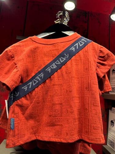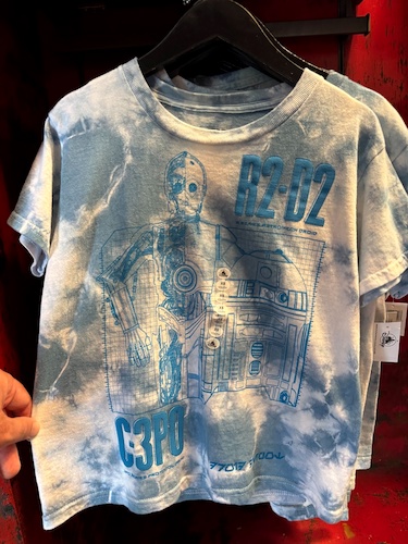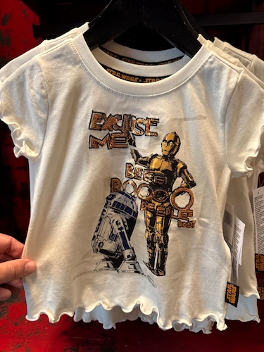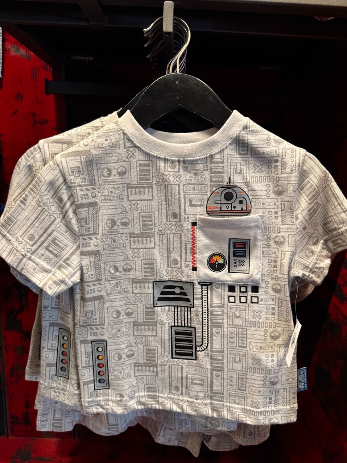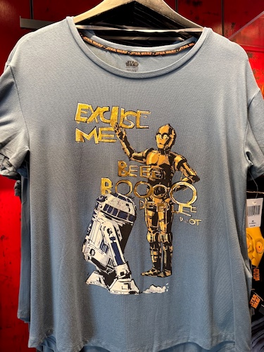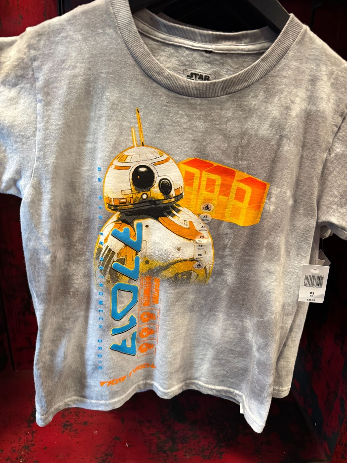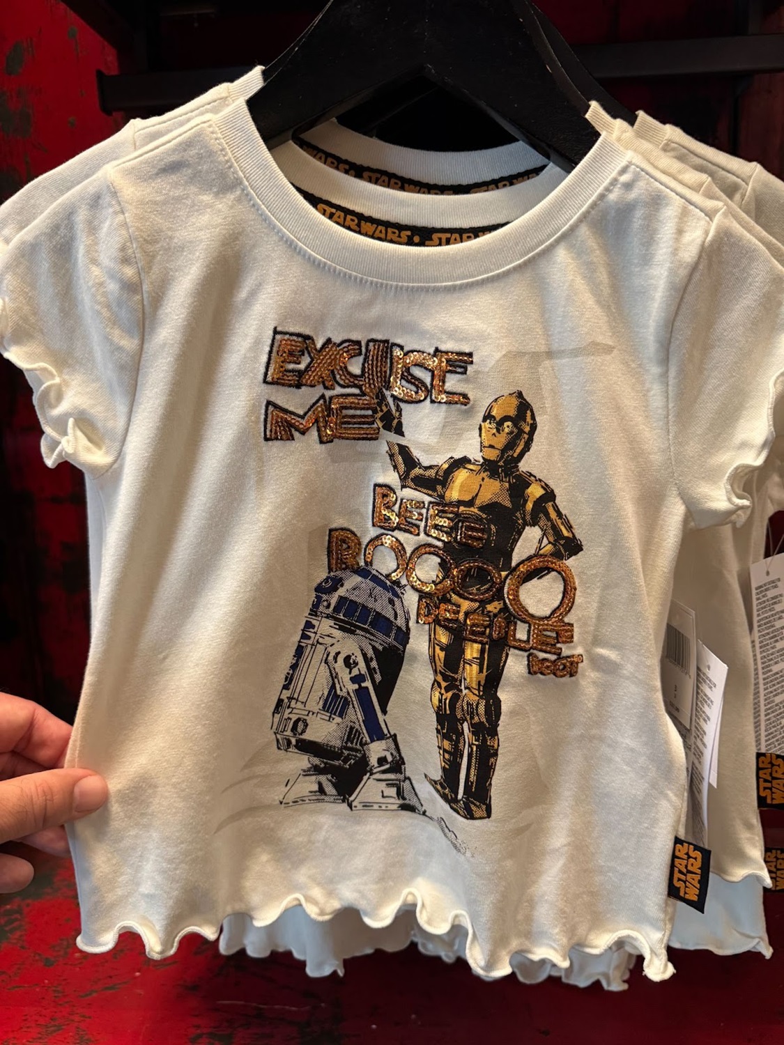 In this following section we have an R2-D2 and C-3PO tie-dyed shirt ($26.99) with Aurebesh reading “Droid Depot." Next there’s an R2-D2 shirt ($34.99) that matches the others we saw earlier, with Aurebesh reading “Astromech" and “Black Spire Outpost." Then there’s a more colorful shirt ($34.99) starring both R2-D2 and C-3PO and the text “Excuse me" and “Beeee-Booooo-Deedlee-Doot!" That same design is available on frilly white in child sizes ($31.99) and then there’s another colorful BB-8 child-sized shirt ($26.99) with Aurebesh reading “Droid" and “Droid Depot."