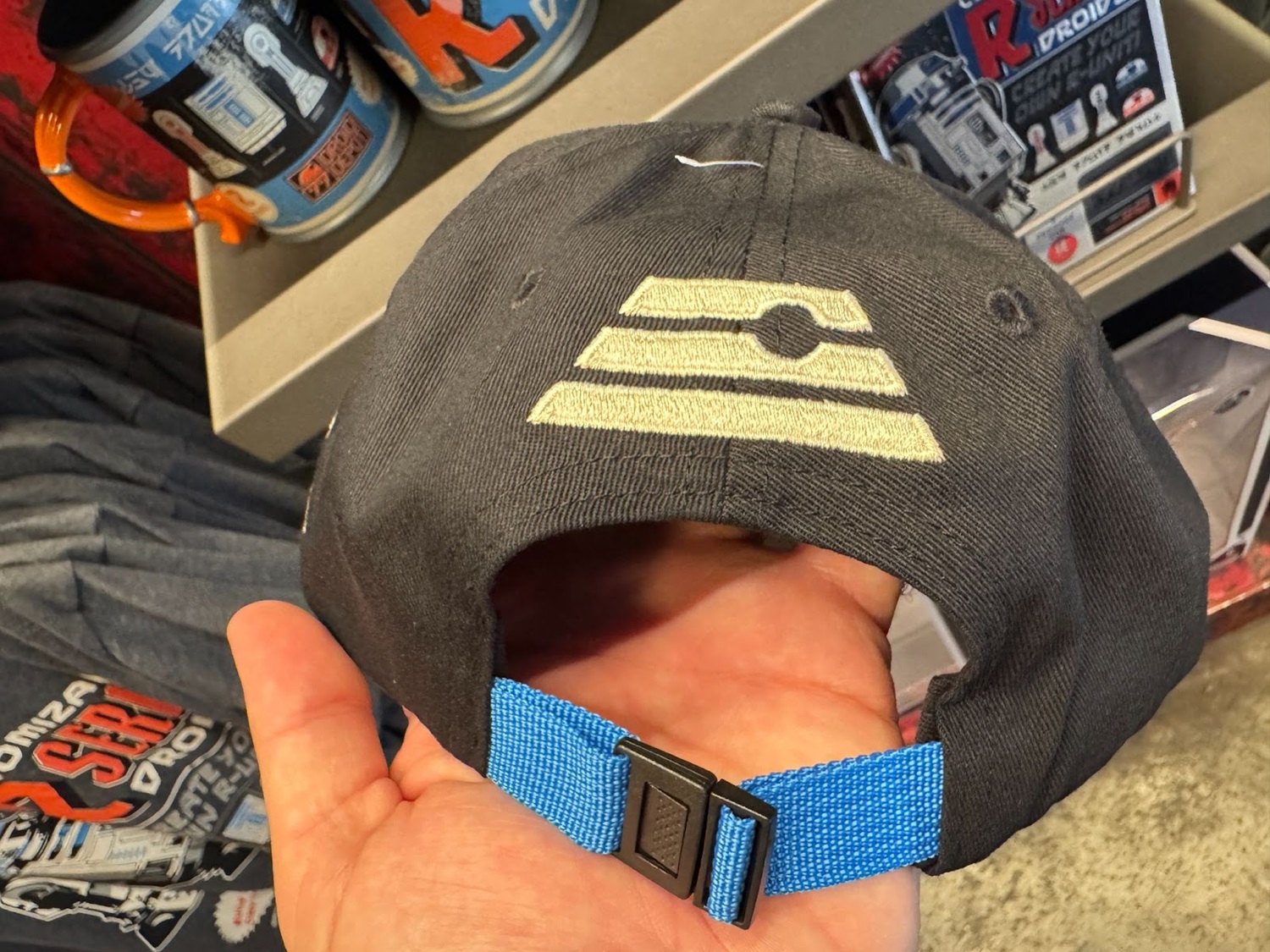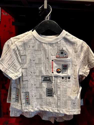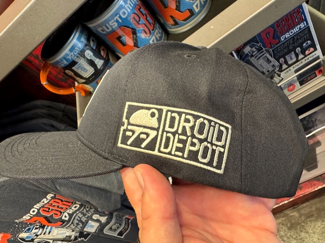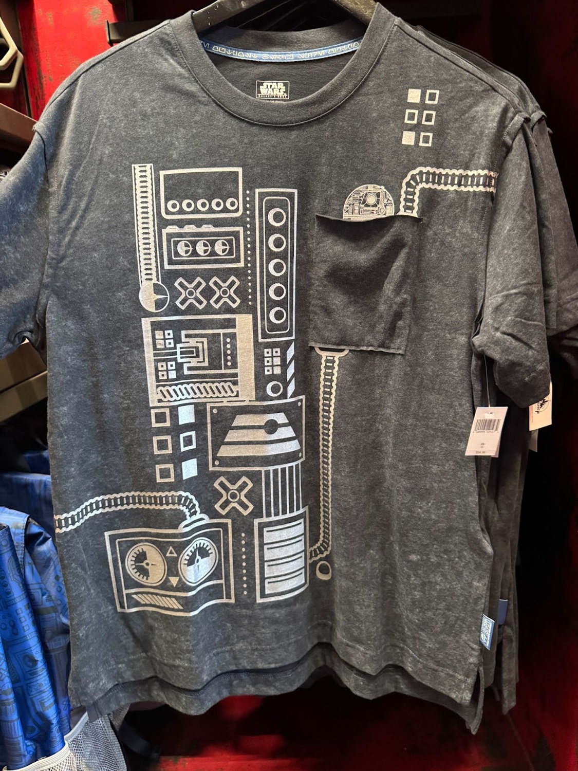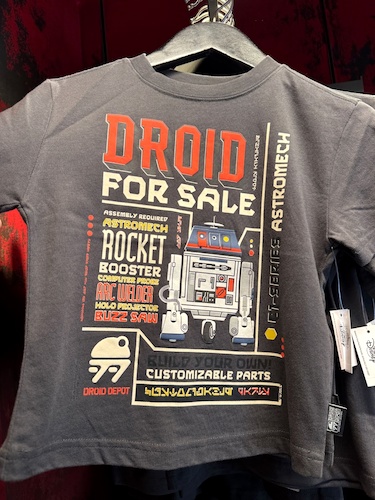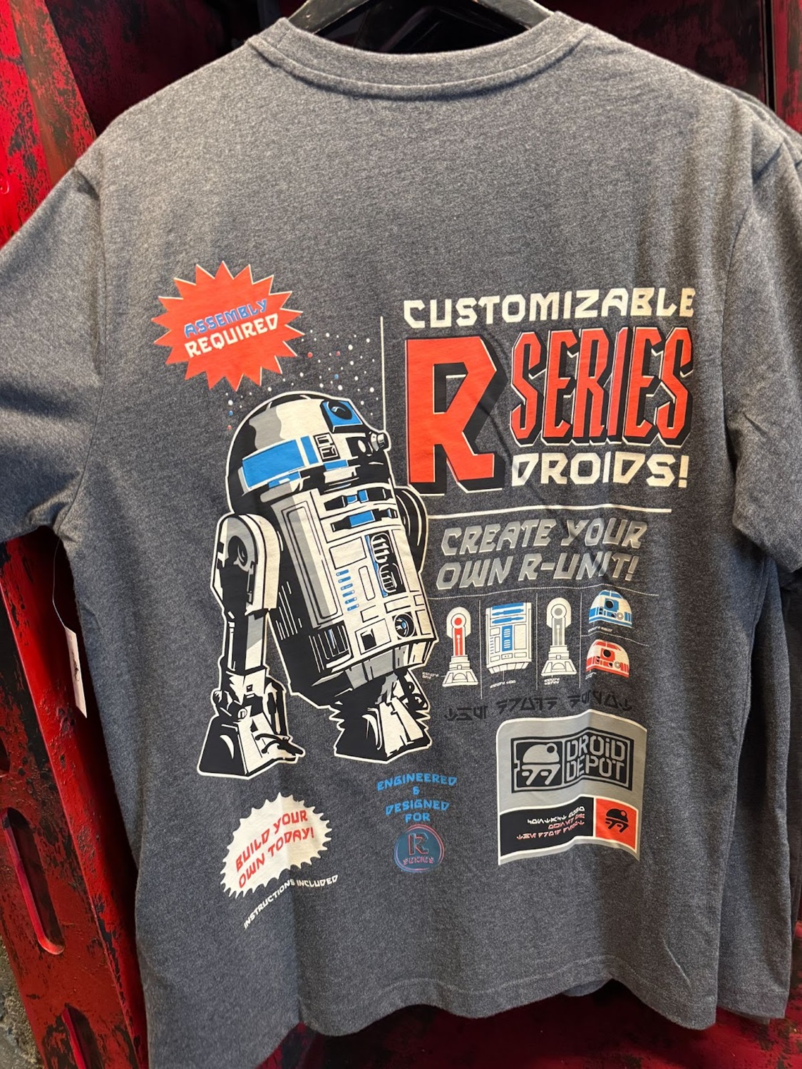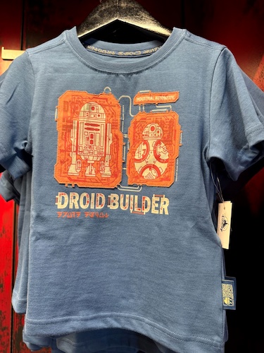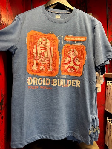 Here we have a Droid Builder t-shirt in adult ($34.99) and child ($26.99) sizes with Aurebesh reading “Droid Depot," plus an Astromech droid hat ($29.99).