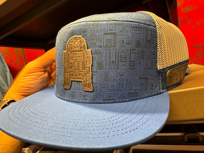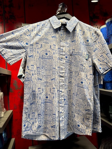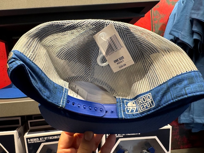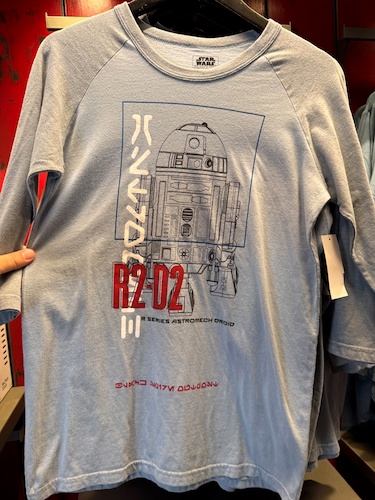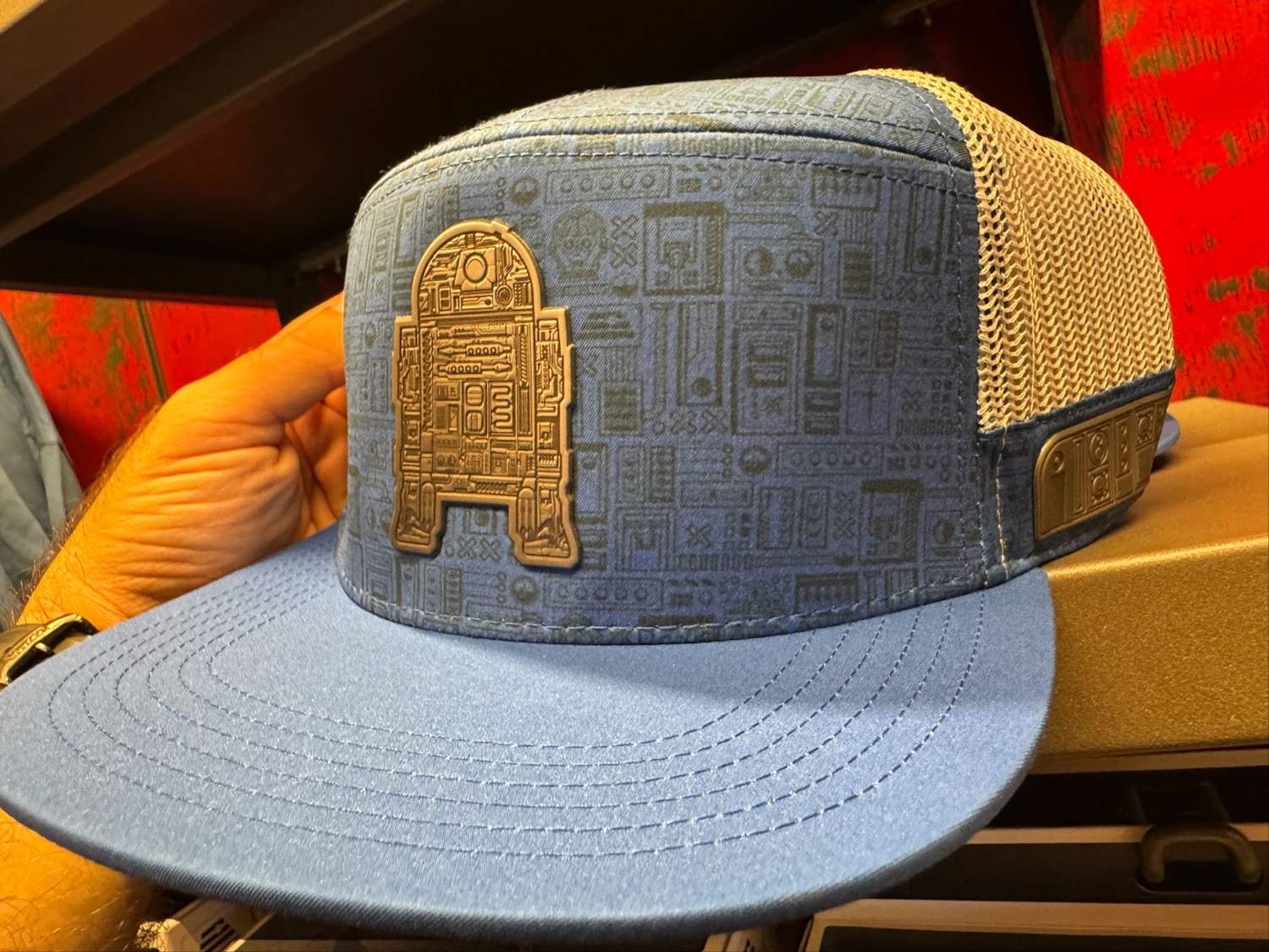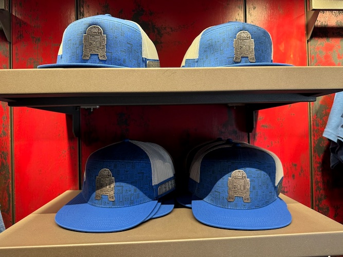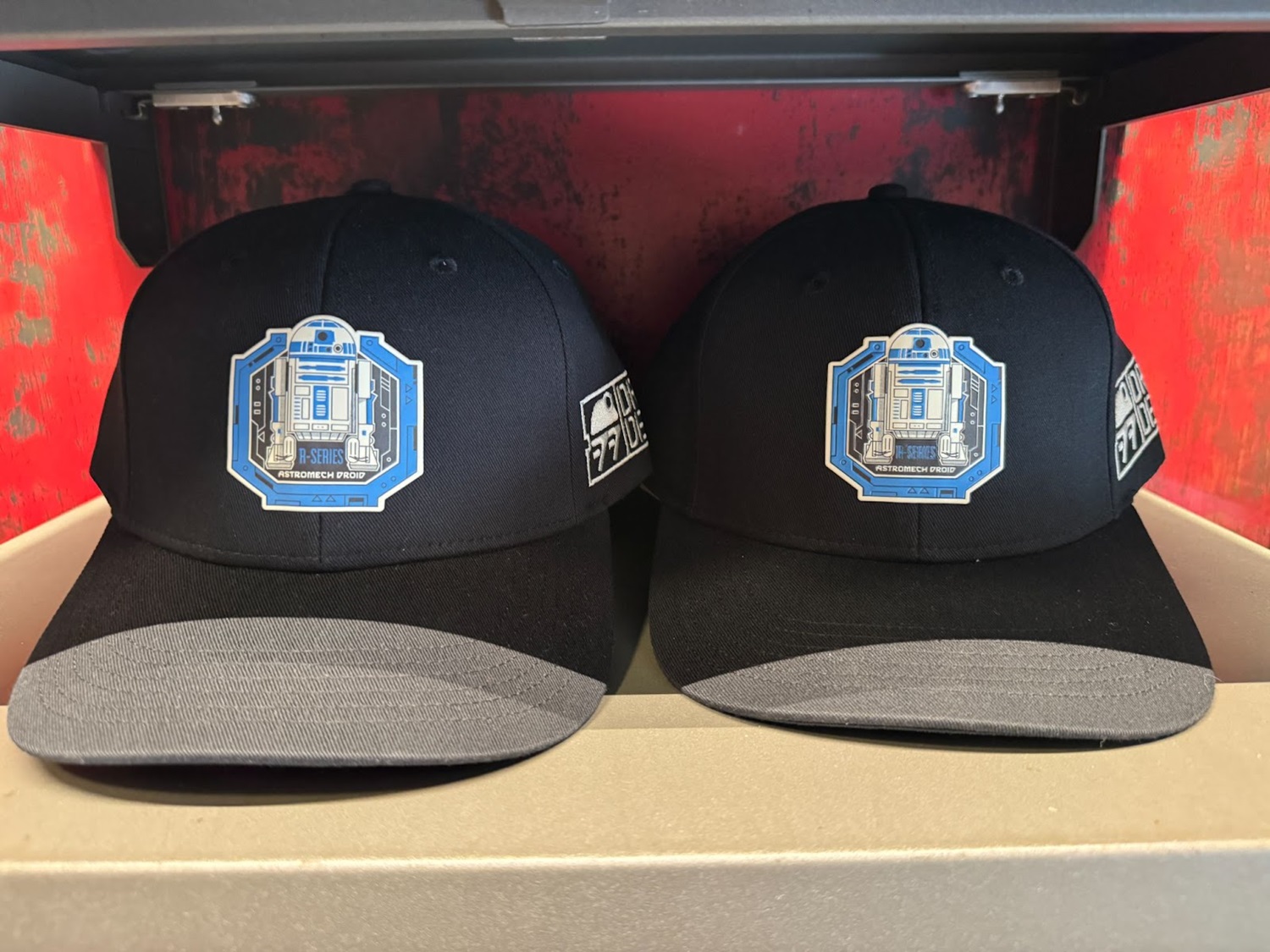 Here we have a Droid Builder t-shirt in adult ($34.99) and child ($26.99) sizes with Aurebesh reading “Droid Depot," plus an Astromech droid hat ($29.99).