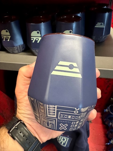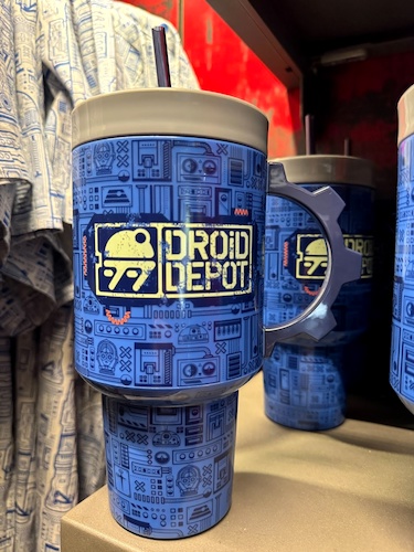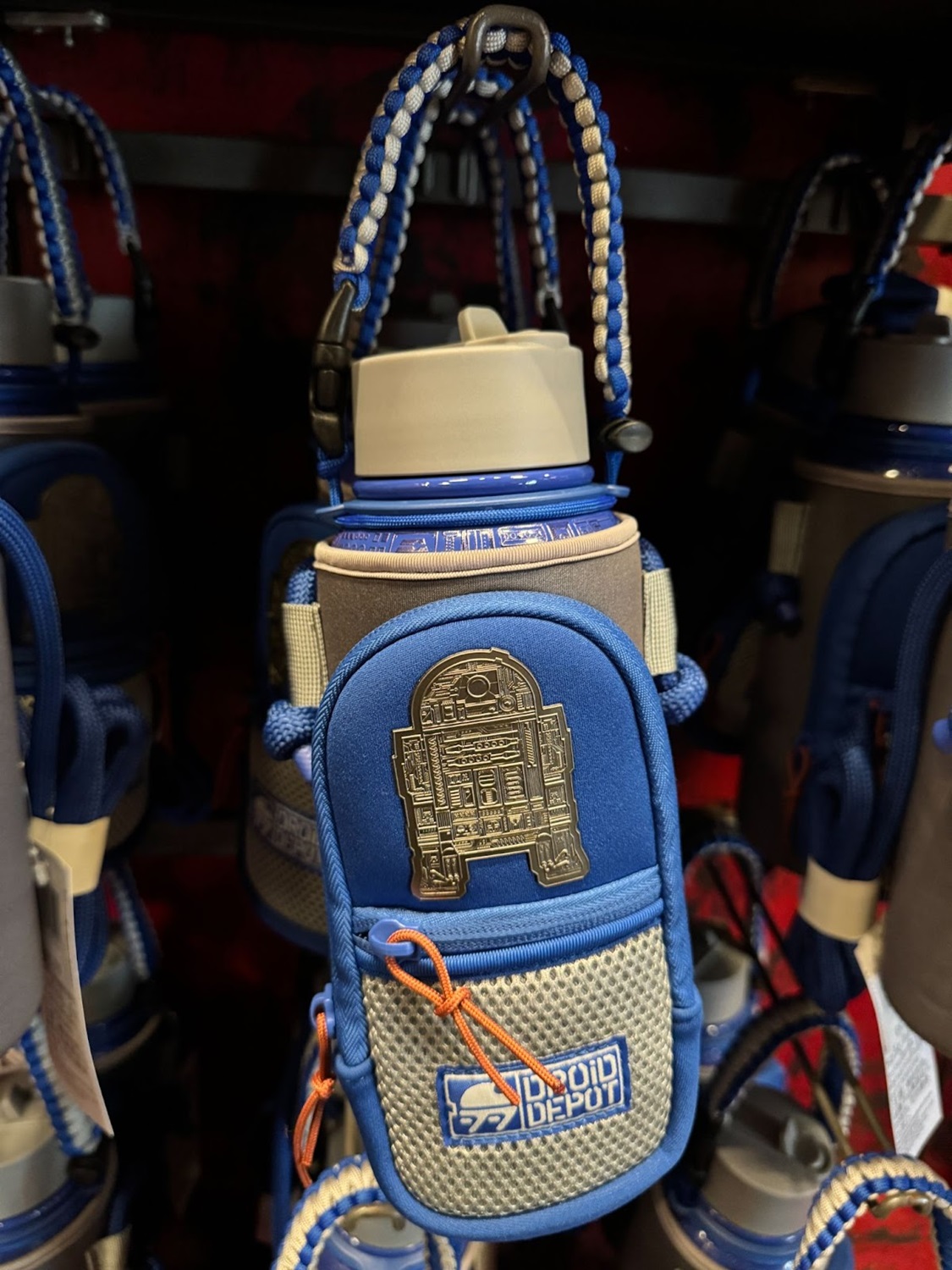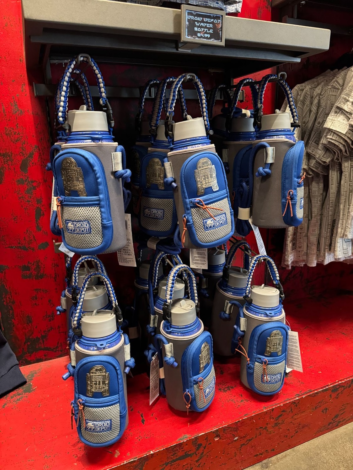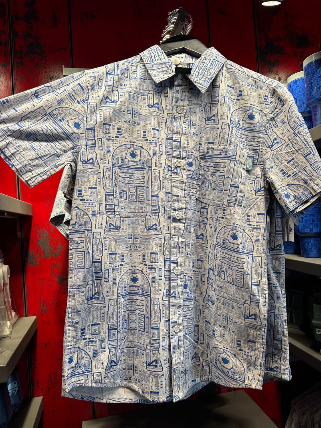 Now let’s venture into Droid Depot’s second room, where there’s a nice new R2-D2 button-down shirt ($69.99), plus a ceramic R2-D2 canister ($49.99), a Droid Depot tumbler and stemless tumbler (both $27.99), ceramic Gonk Droid mugs ($27.99), a Droid Depot hoodie ($44.99), a Droid Depot water bottle with strapped holder ($64.99), and a child-sized BB-8 shirt ($31.99).