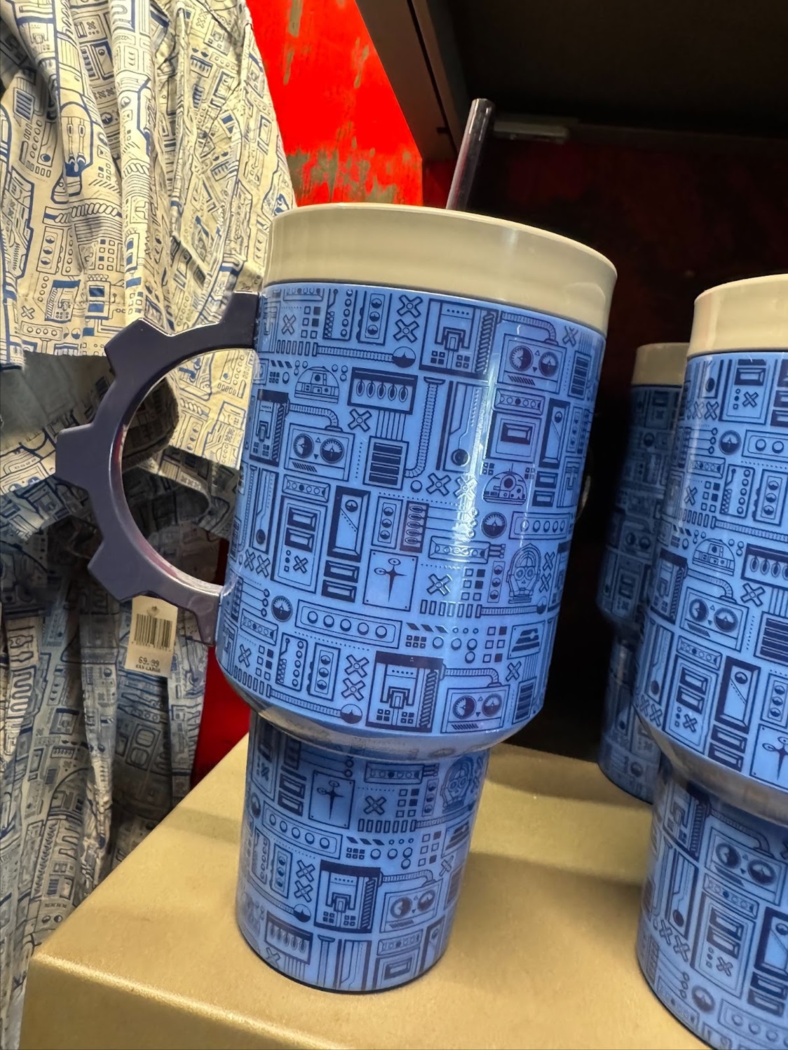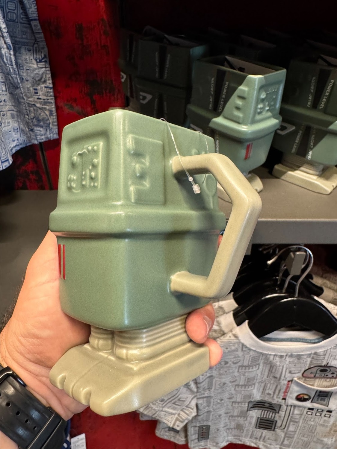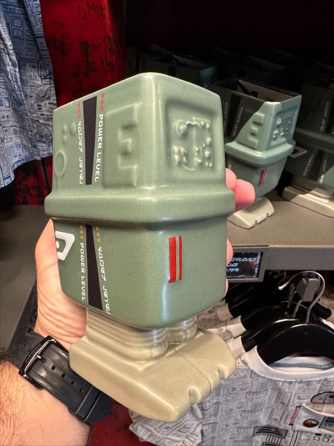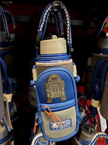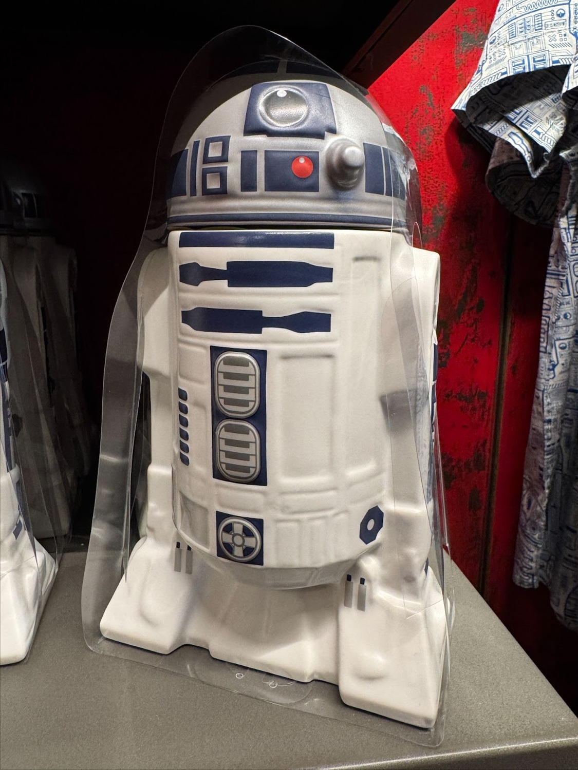 Now let’s venture into Droid Depot’s second room, where there’s a nice new R2-D2 button-down shirt ($69.99), plus a ceramic R2-D2 canister ($49.99), a Droid Depot tumbler and stemless tumbler (both $27.99), ceramic Gonk Droid mugs ($27.99), a Droid Depot hoodie ($44.99), a Droid Depot water bottle with strapped holder ($64.99), and a child-sized BB-8 shirt ($31.99).