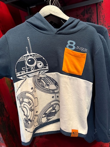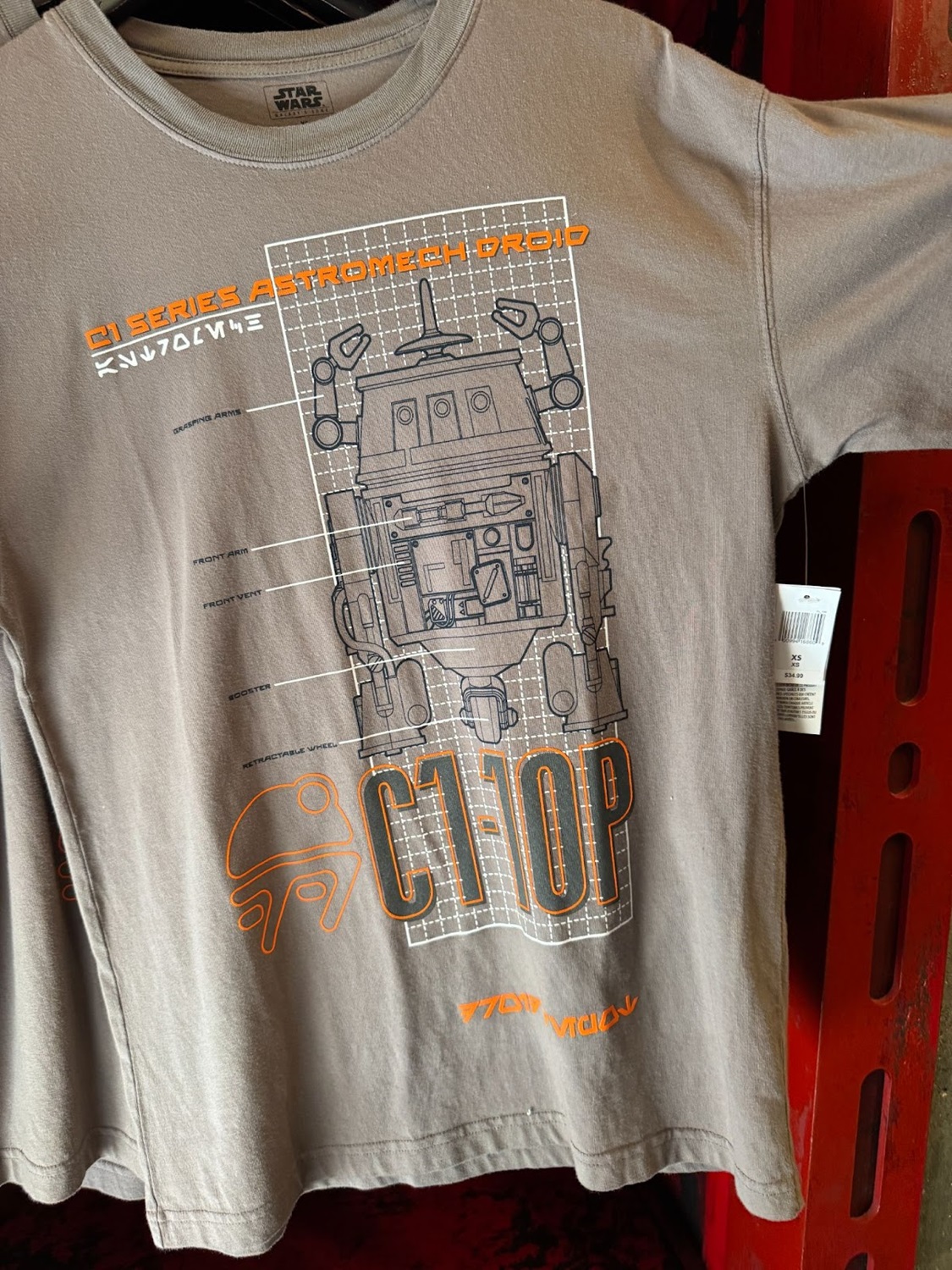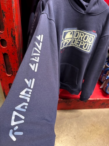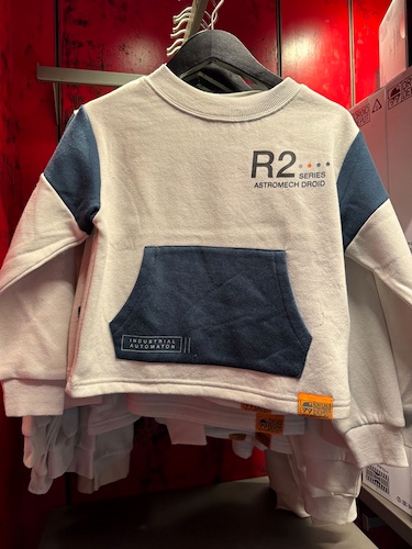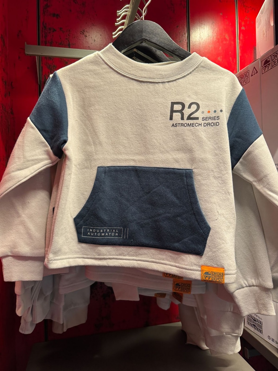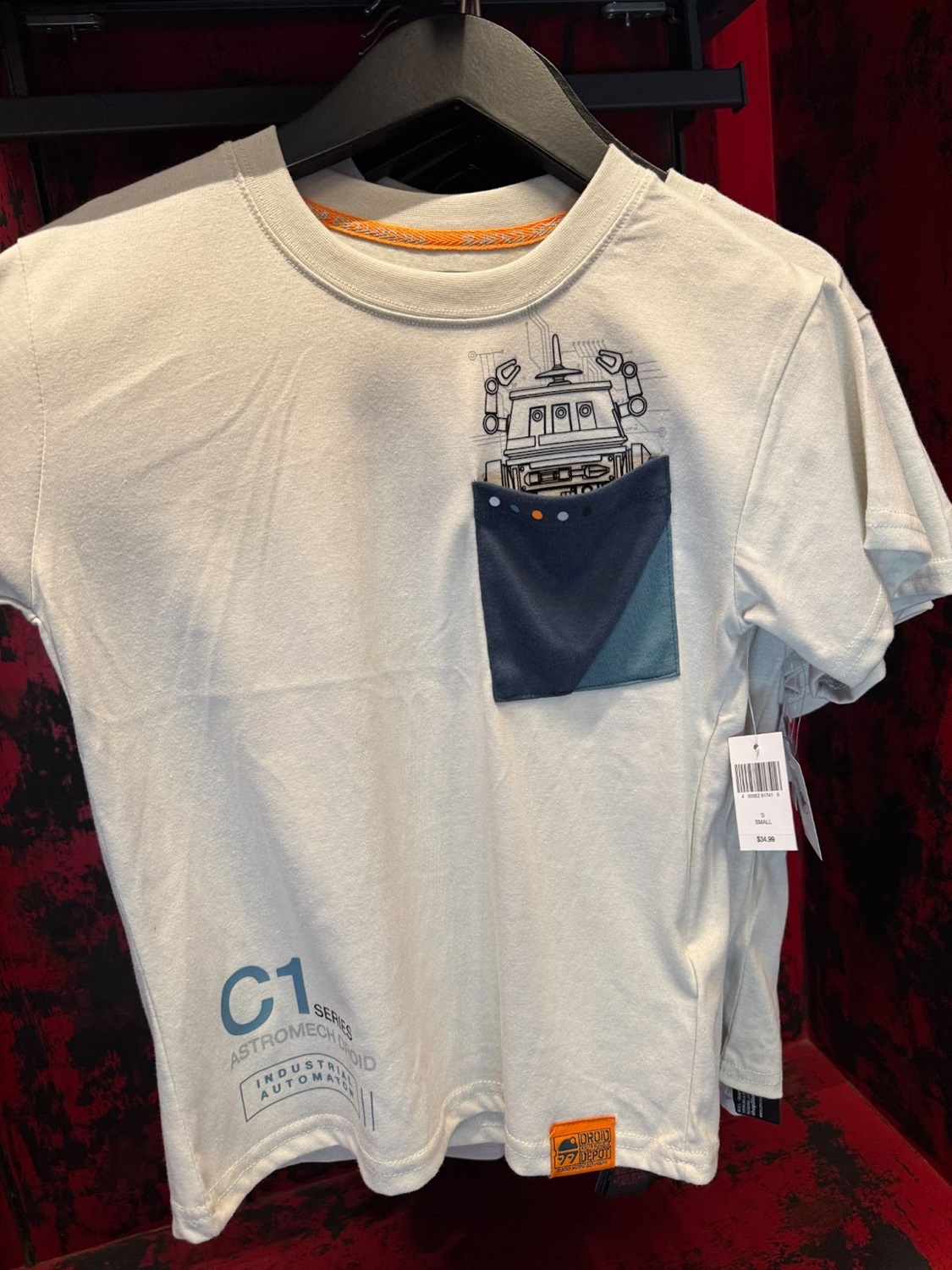 Lastly I found some additional child-sized shirts, sweaters, and hoodies depicting Chopper with Aurebesh reading “Astromech" and “Droid Depot" ($34.99), the text “R2 Series Astromech Droid" and “Industrial Automaton" ($49.99), BB-8 with the text “BB-Series Astromech" ($49.99), and Chopper with the text “C1-Series Astromech Droid" ($34.99).