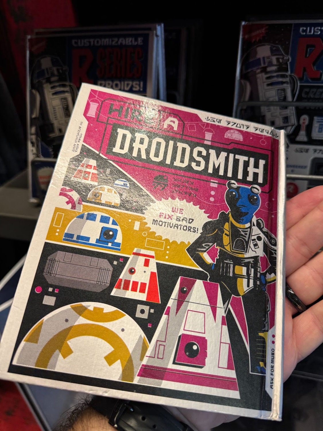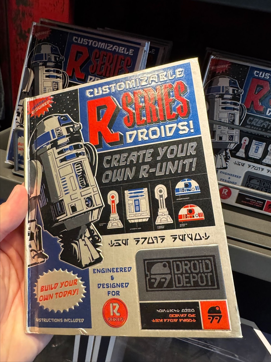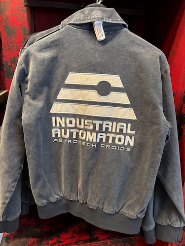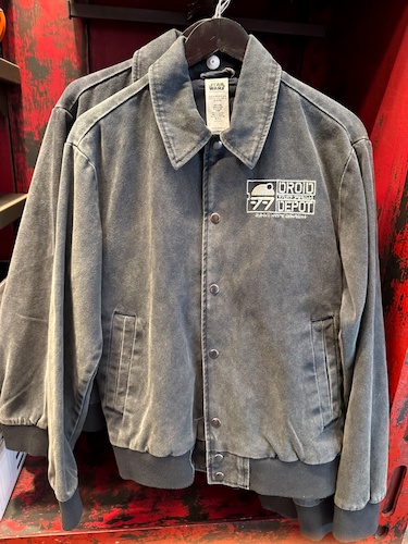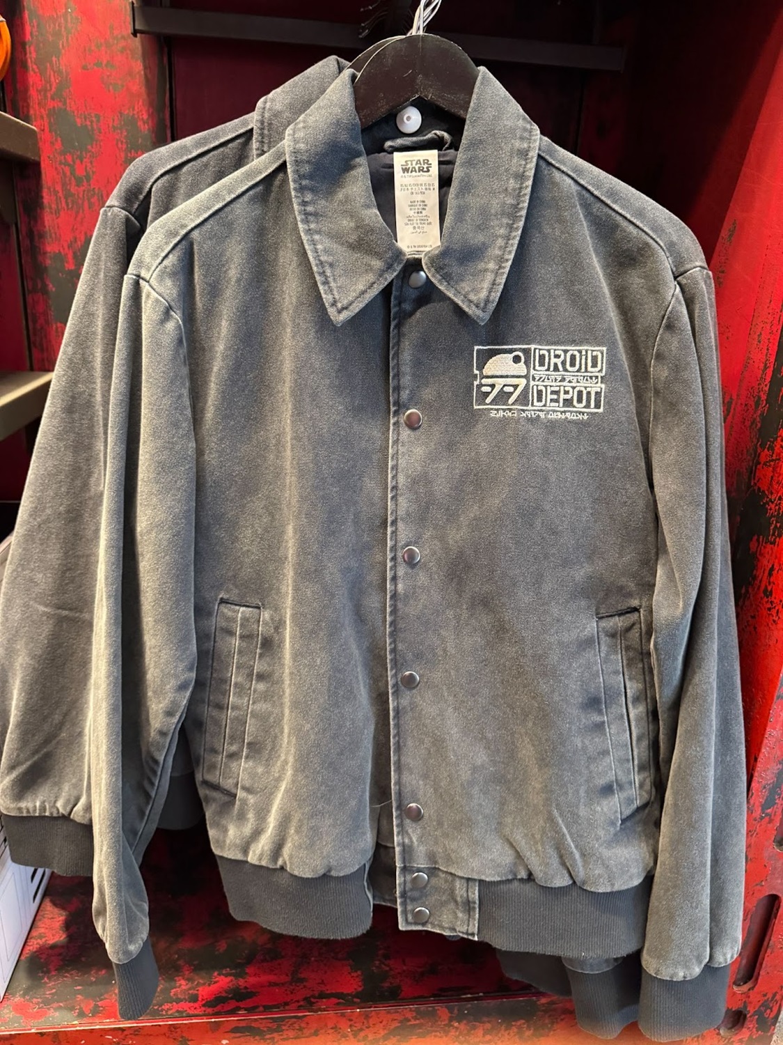 Next we have a child-sized “Droid for Sale" t-shirt ($26.99) with Aurebesh that reads “Tools Available" and “Contact us for all your droid needs" and an adult-sized Customizable R-Series Droids t-shirt ($34.99) with Aurebesh that reads “The Droid Depot" and “Contact Mubo - Owner of the Droid Depot." There’s also an R-Series metal sign ($49.99), an R2-D2 hat with the Droid Depot logo on its side ($29.99), an R-Series mug with Aurebesh reading “The Droid Depot" ($24.99), and a notebook with the R-Series art on the front and an illustration of Mubo himself on the back ($24.99), and a really nice button-up Industrial Automaton jacket with the Droid Depot logo on the left and Aurebesh that reads “Droid Depot" and “Black Spire Outpost" ($119.99).