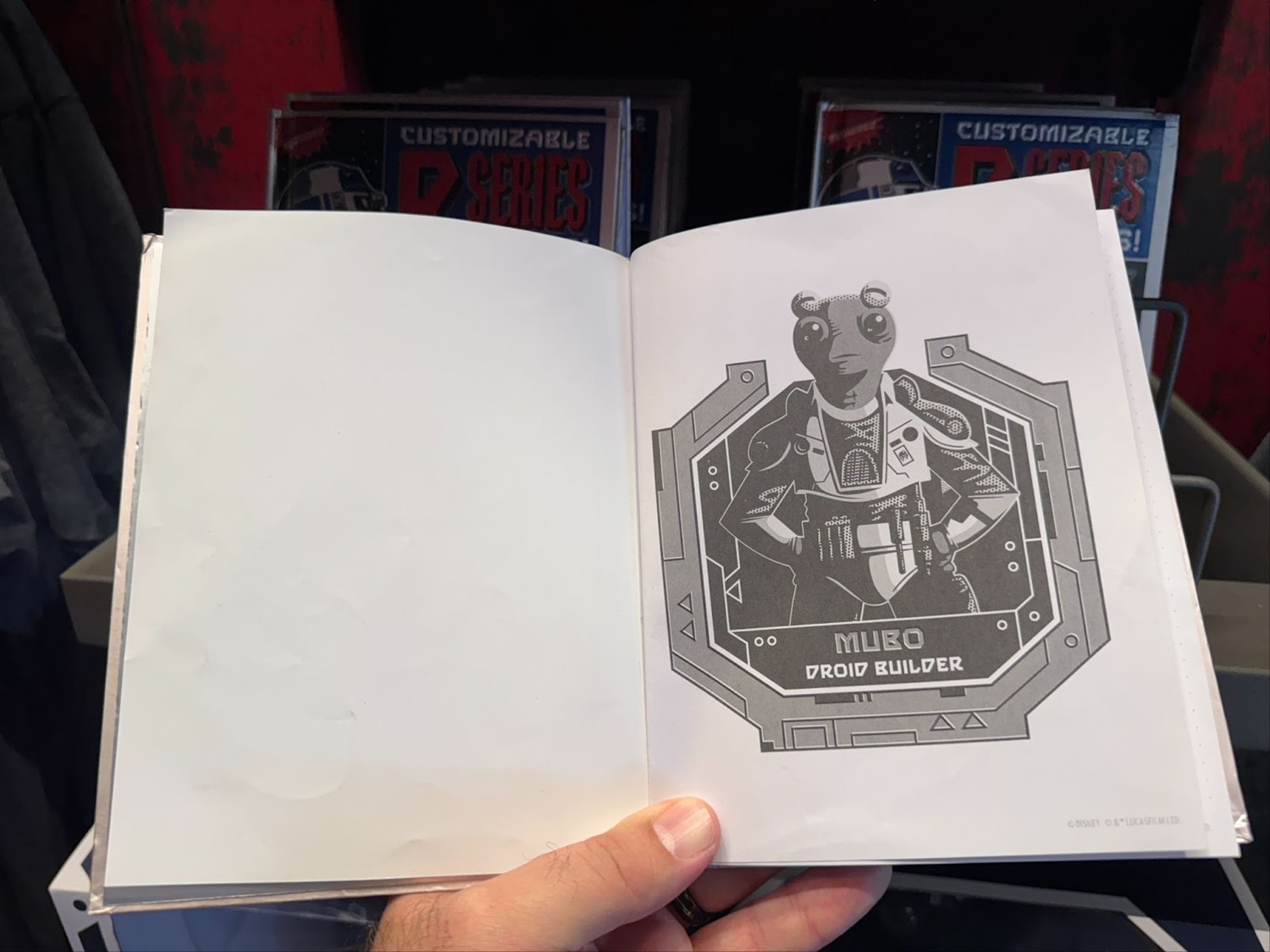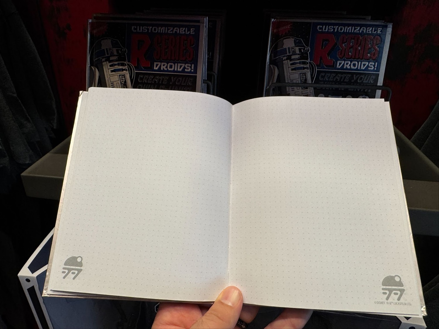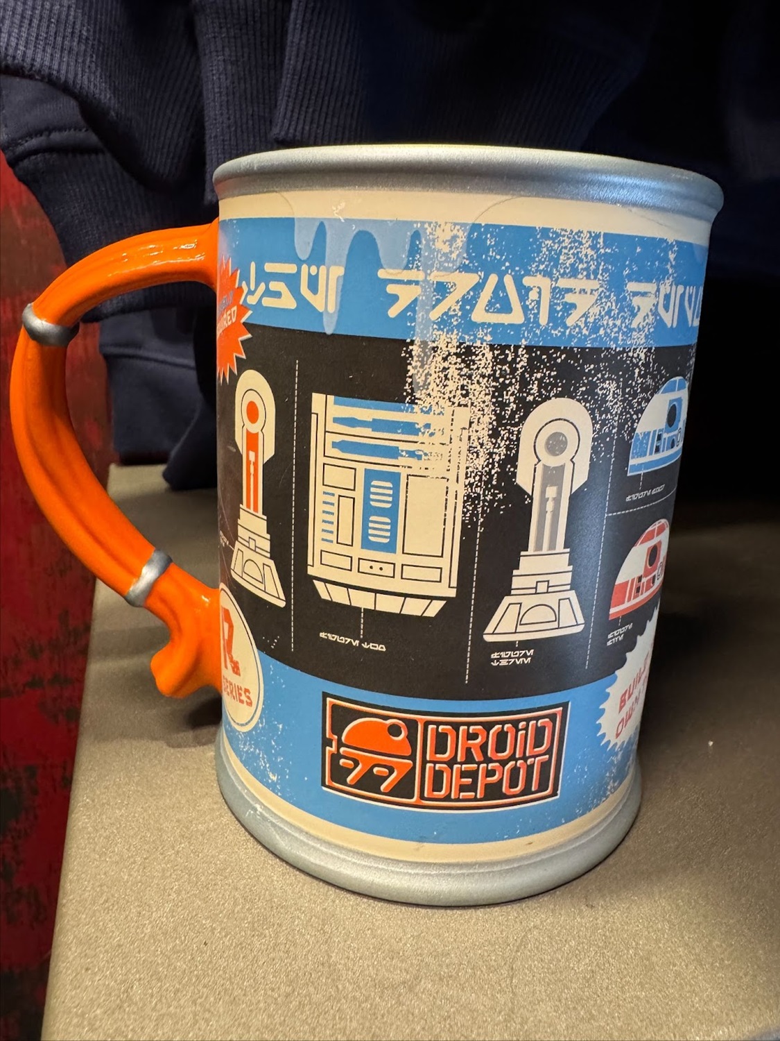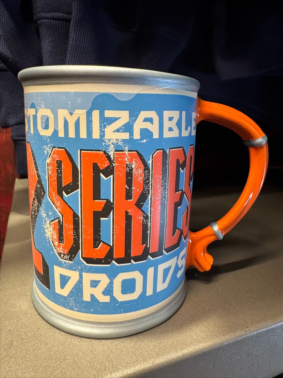 Next we have a child-sized “Droid for Sale" t-shirt ($26.99) with Aurebesh that reads “Tools Available" and “Contact us for all your droid needs" and an adult-sized Customizable R-Series Droids t-shirt ($34.99) with Aurebesh that reads “The Droid Depot" and “Contact Mubo - Owner of the Droid Depot." There’s also an R-Series metal sign ($49.99), an R2-D2 hat with the Droid Depot logo on its side ($29.99), an R-Series mug with Aurebesh reading “The Droid Depot" ($24.99), and a notebook with the R-Series art on the front and an illustration of Mubo himself on the back ($24.99), and a really nice button-up Industrial Automaton jacket with the Droid Depot logo on the left and Aurebesh that reads “Droid Depot" and “Black Spire Outpost" ($119.99).