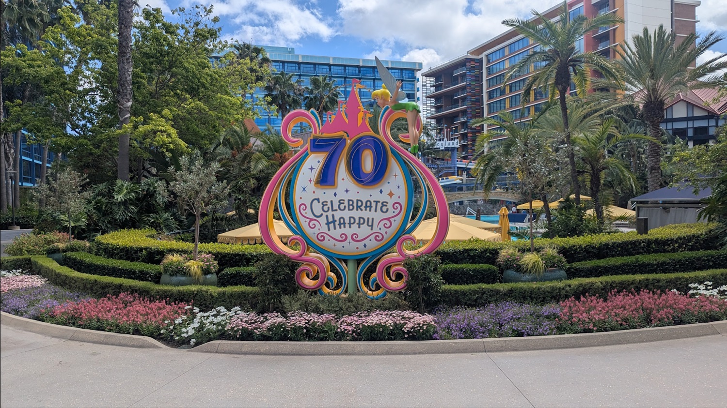 As found elsewhere in the Disneyland Resort, you’ll find this colorful sign near the E-Ticket Pool featuring the Disneyland 70 logo and the tagline “Celebrate Happy!" This one specifically features Tinker Bell spreading pixie dust.
