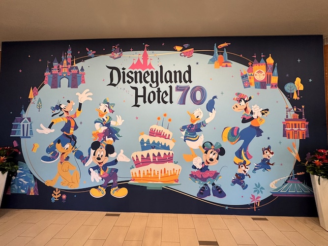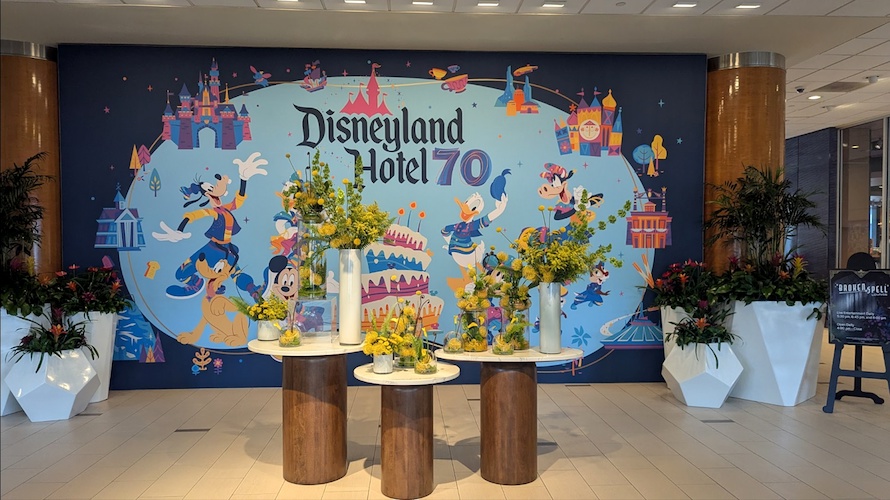 As soon as guests arrive for their stay at the Disneyland Hotel, they’ll immediately be greeted by some fun decor for the Disneyland Resort 70th Celebration.