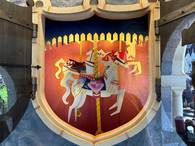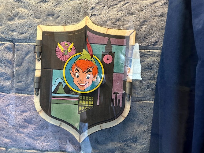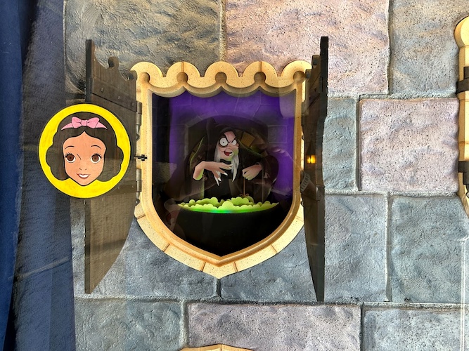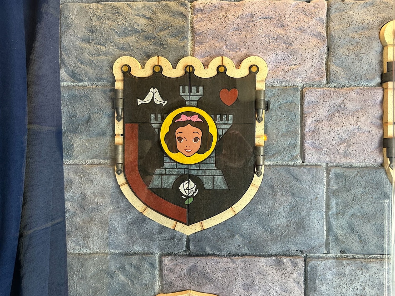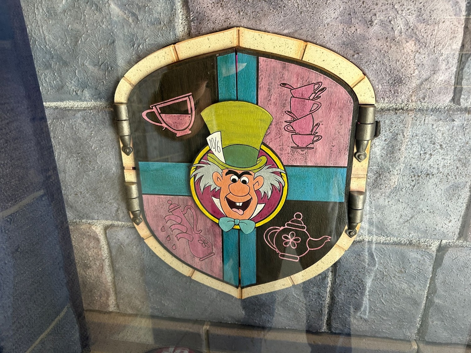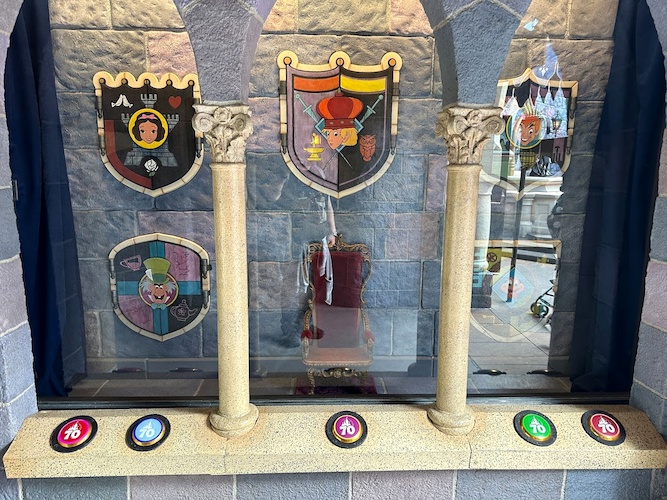While this special interaction wasn’t ready for us on Tuesday, we were able to check it out today. Celebrating classic Disneyland attractions Snow White’s Scary Adventures/Enchanted Wish, Mad Tea Party, Mr. Toad’s Wild Ride, Peter Pan’s Flight and King Arthur Carousel. As each button is pressed, the shield-shaped doors open, revealing a moving scene inspired by each attraction. There are no tickets dispensed from this installation.