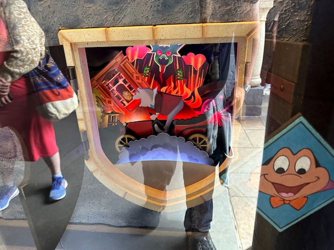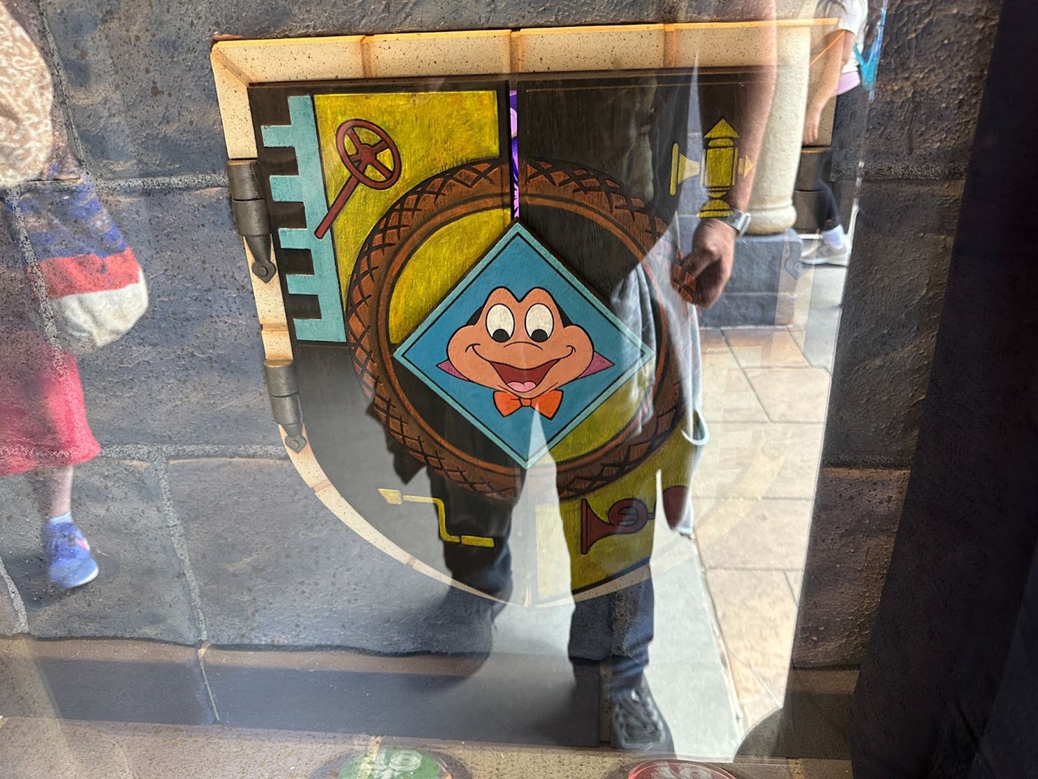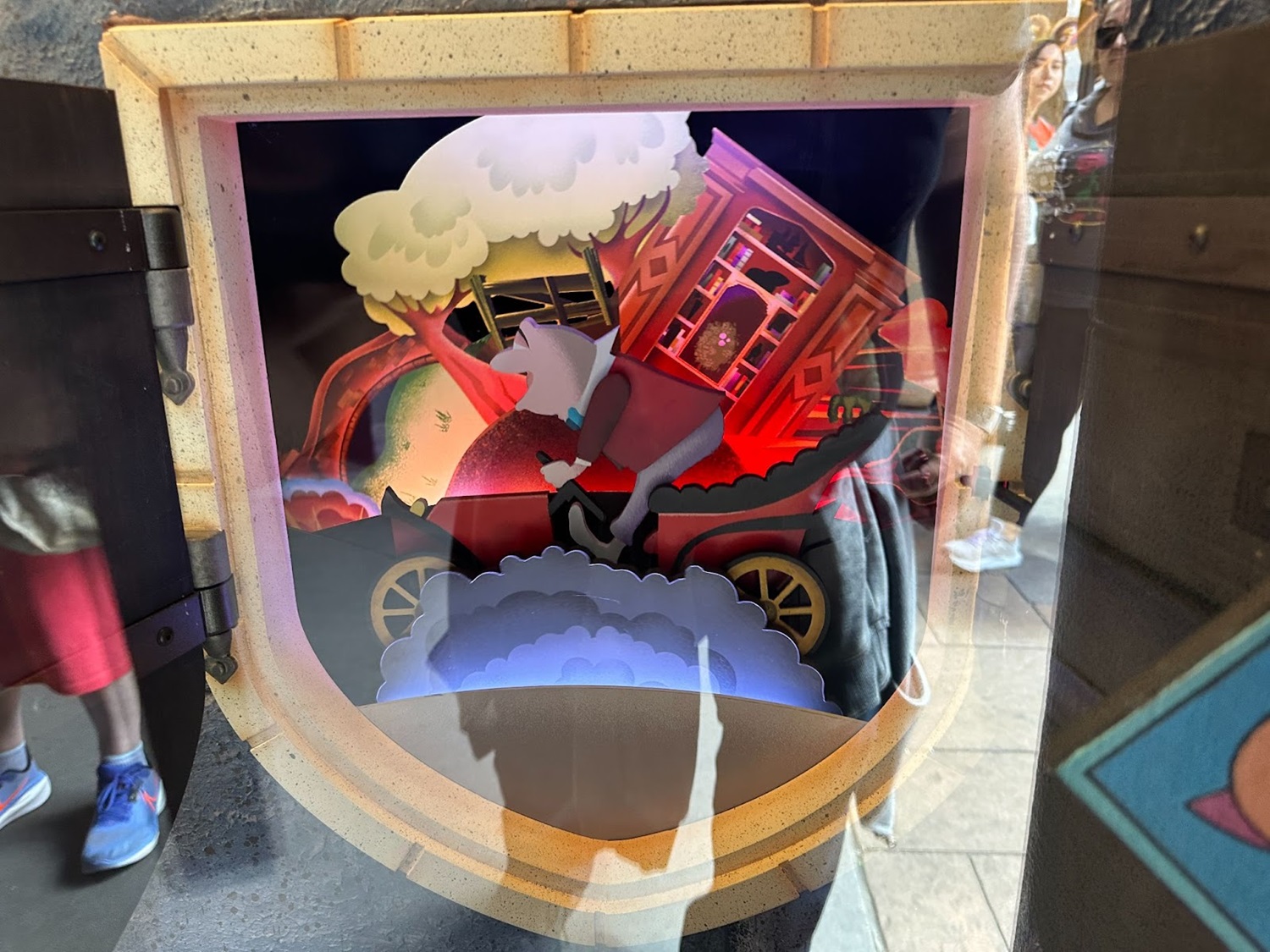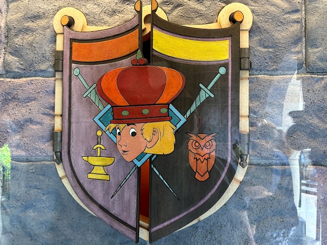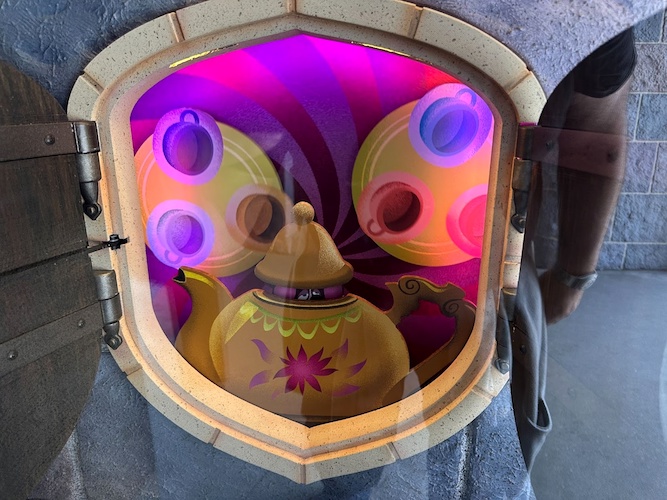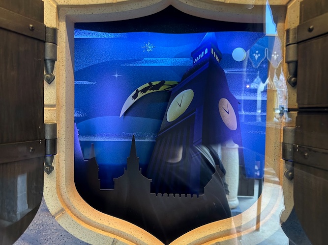 While this special interaction wasn’t ready for us on Tuesday, we were able to check it out today. Celebrating classic Disneyland attractions Snow White’s Scary Adventures/Enchanted Wish, Mad Tea Party, Mr. Toad’s Wild Ride, Peter Pan’s Flight and King Arthur Carousel. As each button is pressed, the shield-shaped doors open, revealing a moving scene inspired by each attraction. There are no tickets dispensed from this installation.