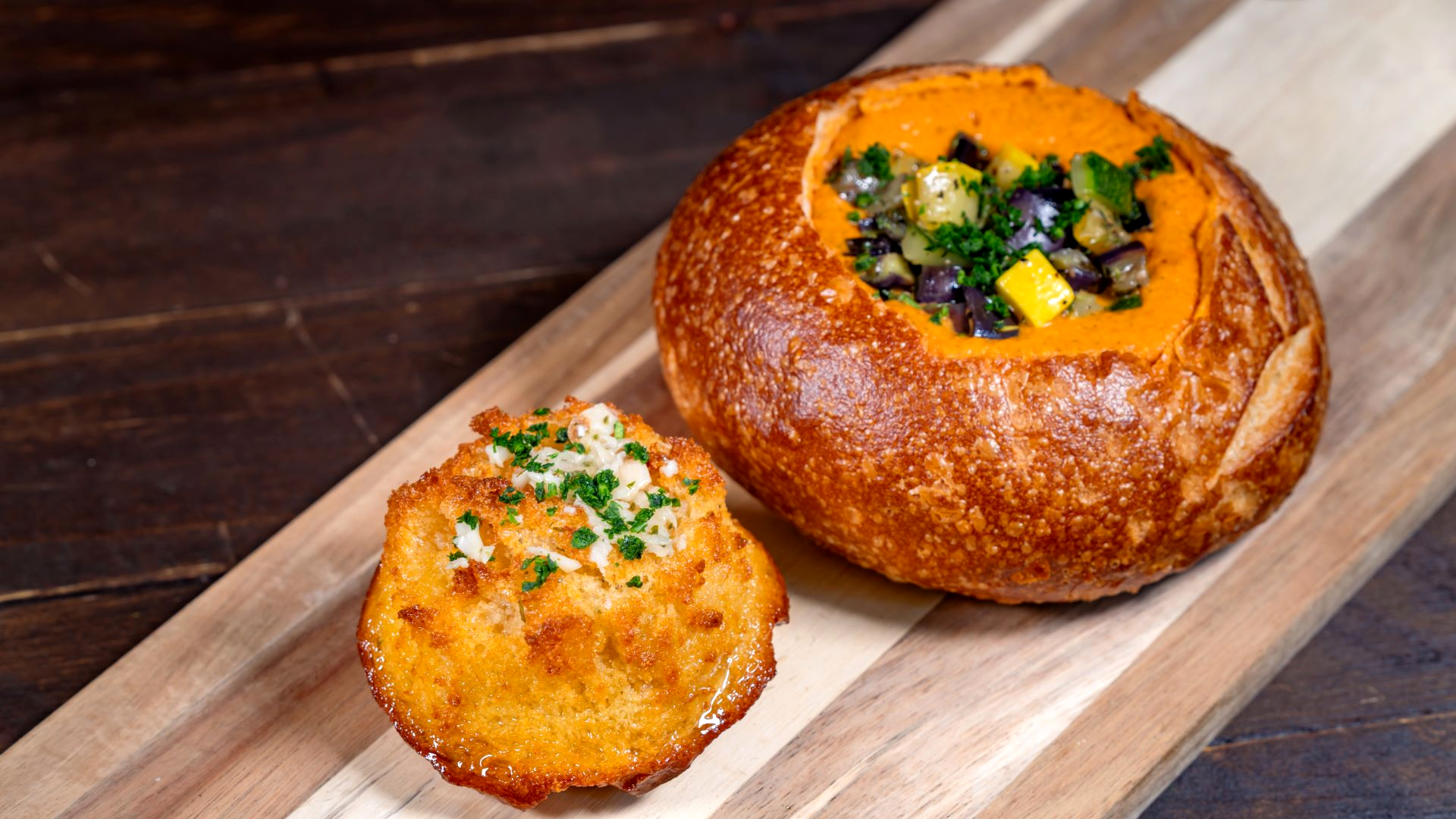 - Ratatouille Soup: Roasted tomatoes, garlic, zucchini, and eggplant garnished with roasted squash and eggplant with garlic bread topper (Plant-based) (New)