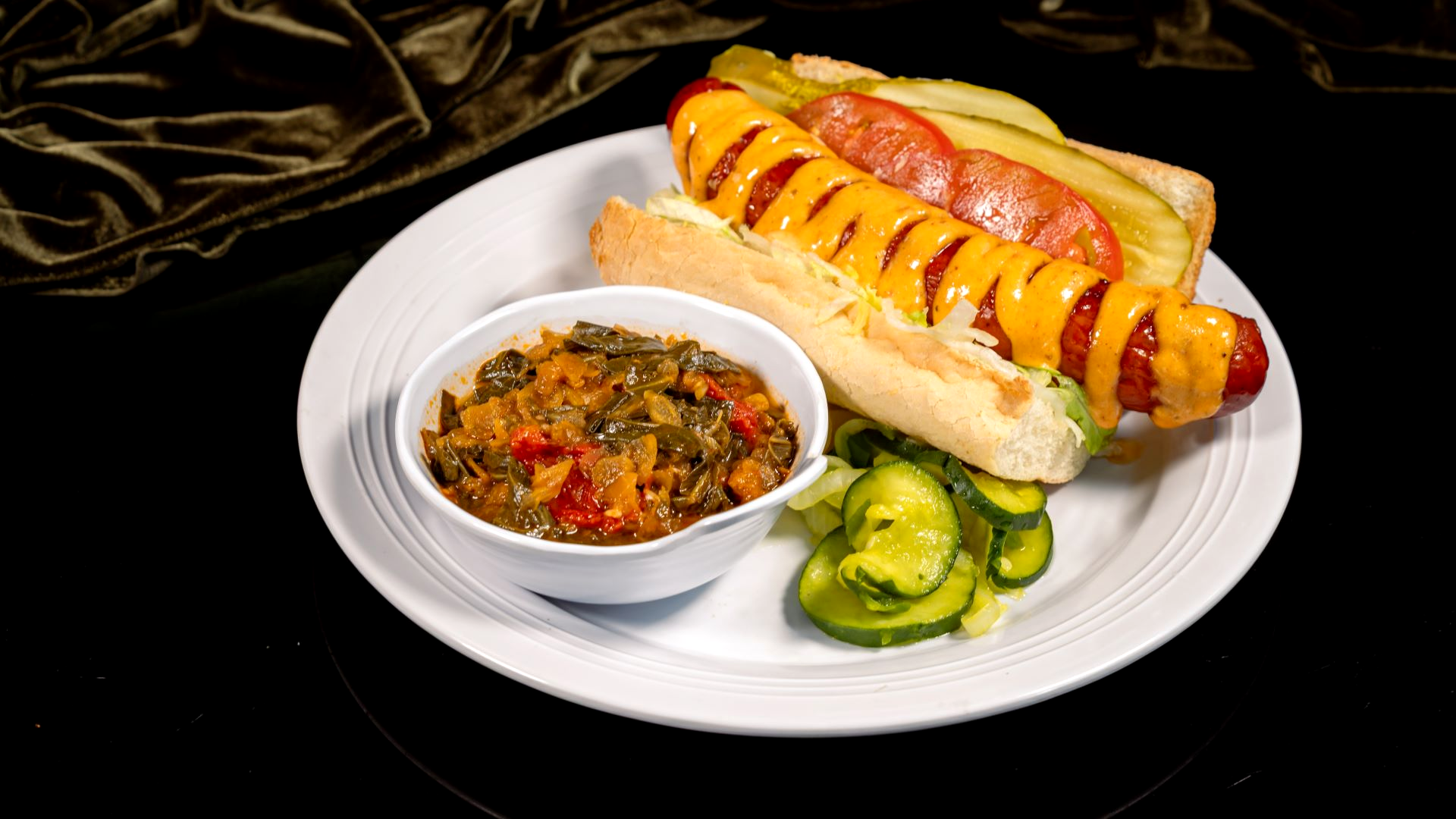 - Andouille Sausage Po’Boy: Roasted andouille sausage, lettuce, tomatoes, mayonnaise, and rémoulade sauce on toasted New Orleans French bread served with collard greens and house-made pickles (New)