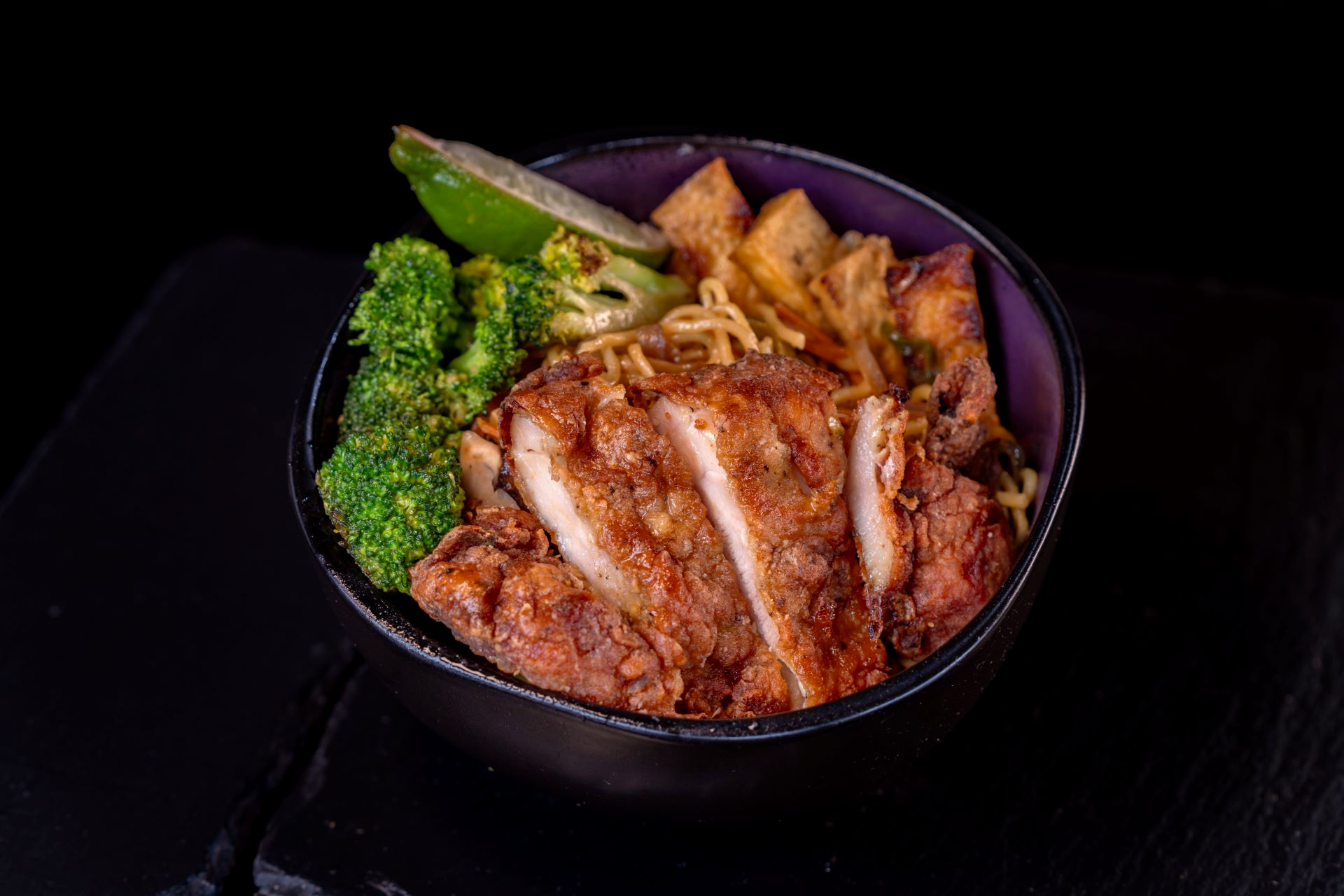- San Fransokyo Noodle Stir-Fry with Karaage-inspired Crispy Chicken: Fried tofu, broccoli, mushrooms, sesame oil, and soy sauce (New)