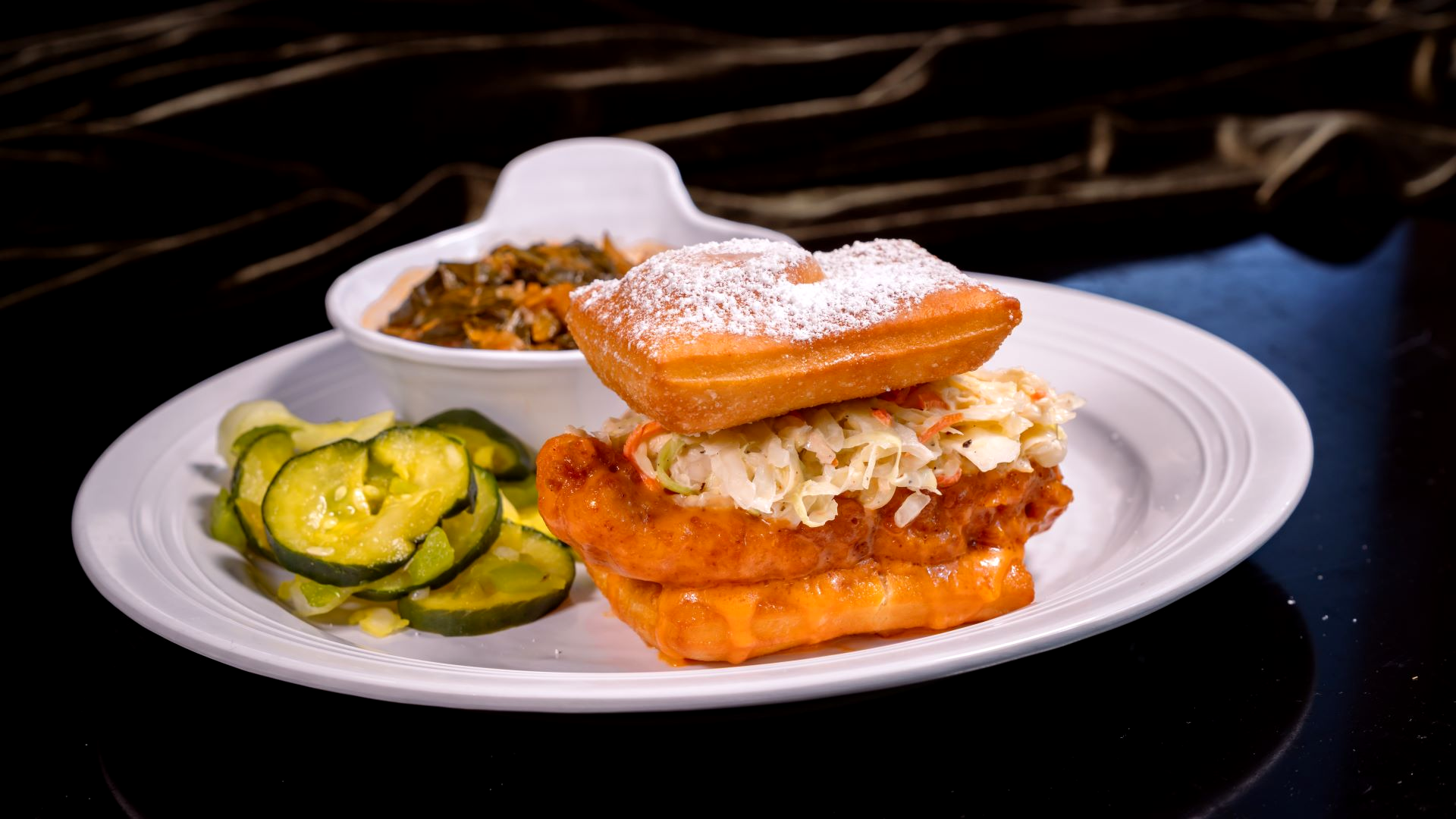 - Sweet Heat Beignet Chicken Sandwich: Fried chicken, Buffalo sauce, and creamy slaw on fresh beignets served with collard greens and house-made pickles (New)