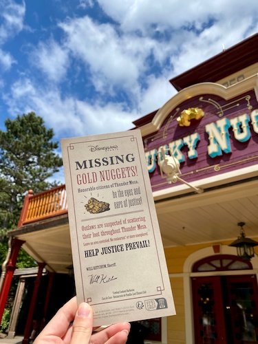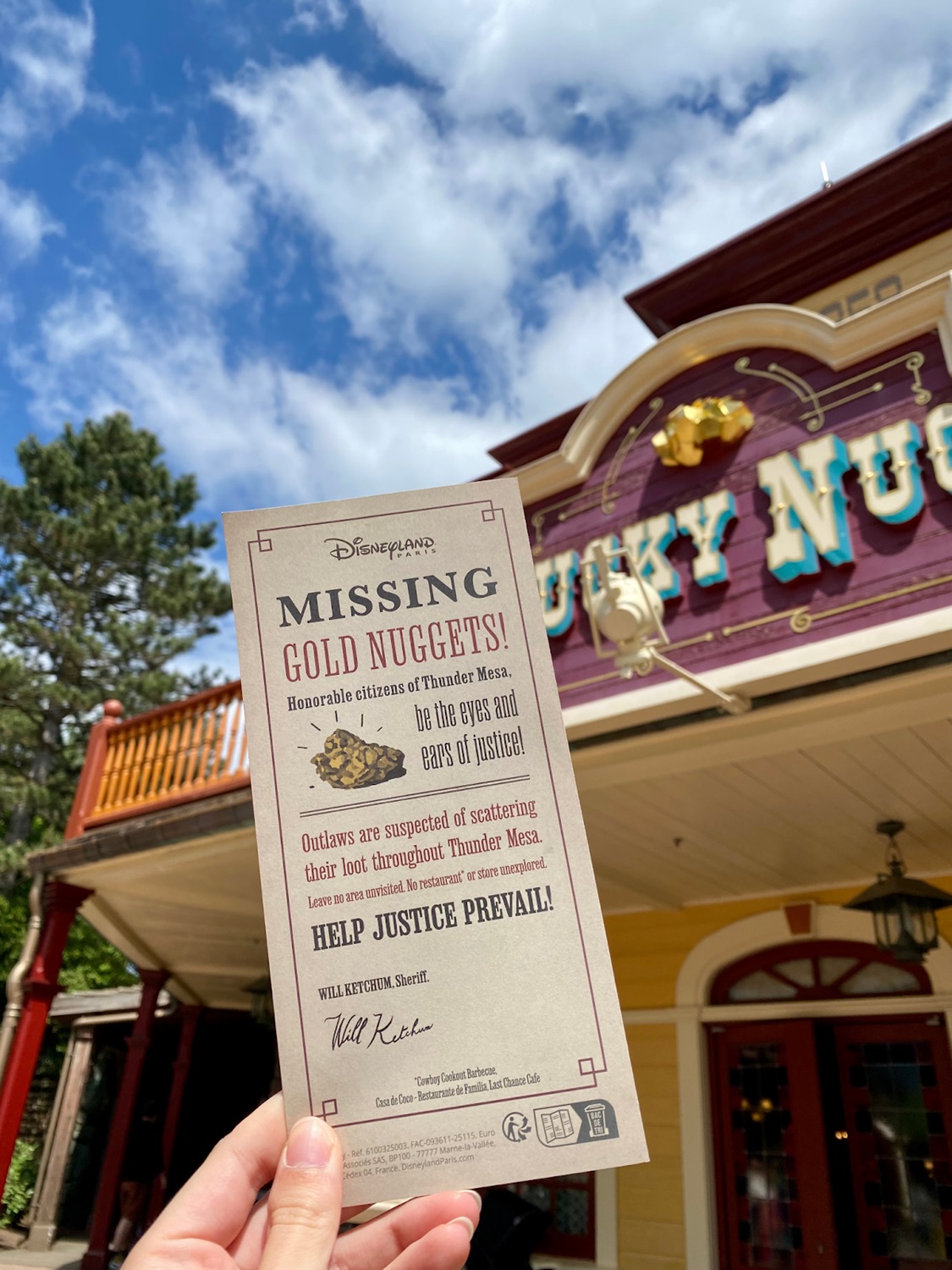 - This experience was designed by the Disneyland Paris Merchandise and On-site Communications teams along with Walt Disney Imagineering Paris. It involves the fictional sheriff of Thunder Mesa, Will Ketchum, and requires guests to pick up a leaflet from Frontierland Cast Members. After finding at least ten gold nuggets around the land, they can return to the Thunder Mesa Mercantile Building for a reward.