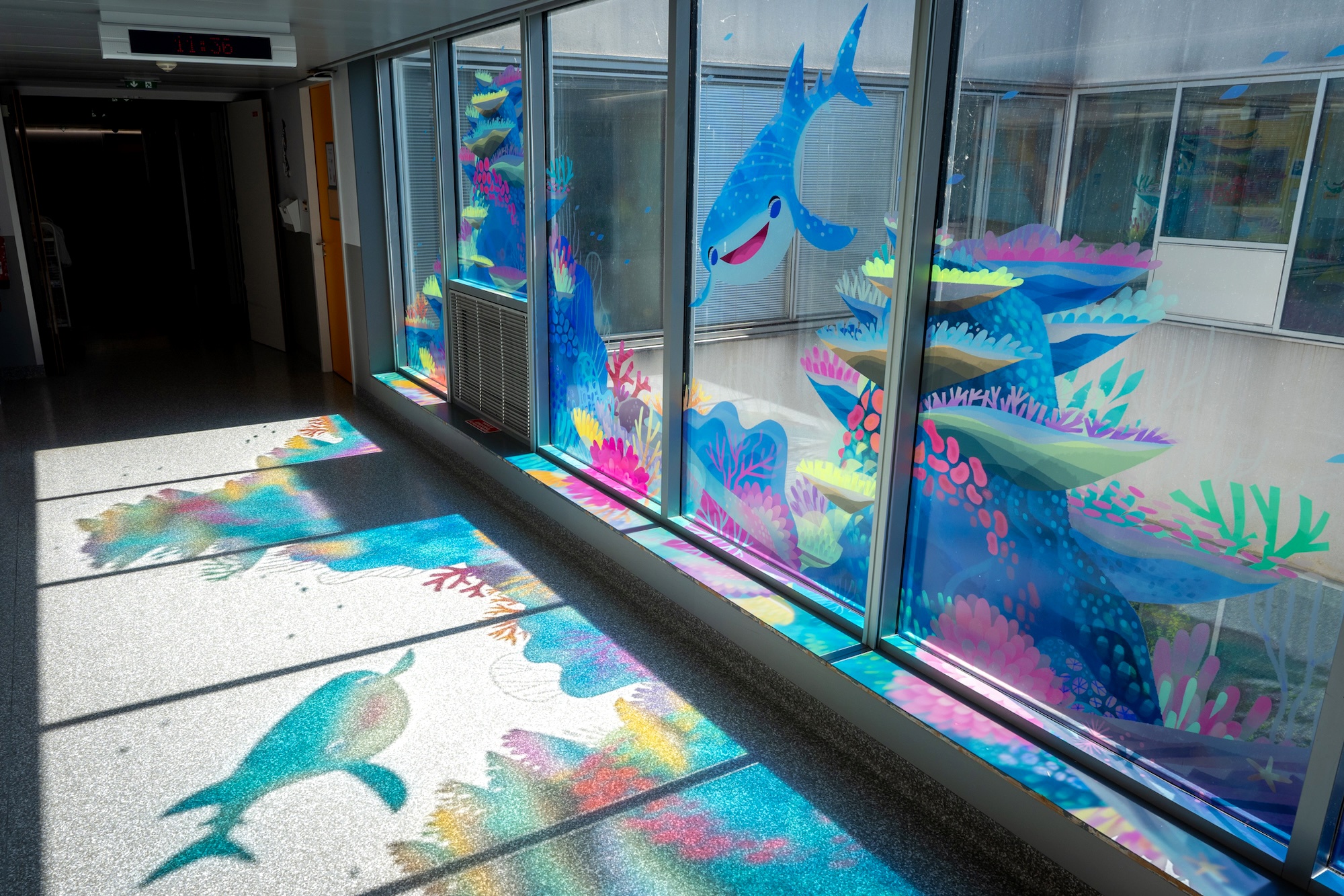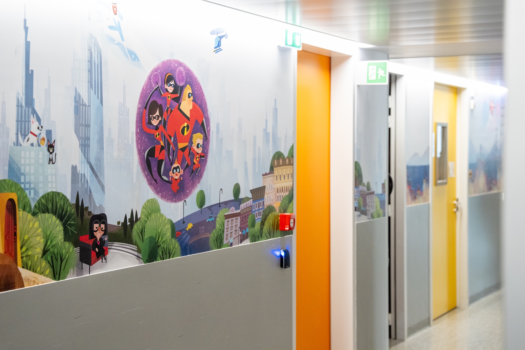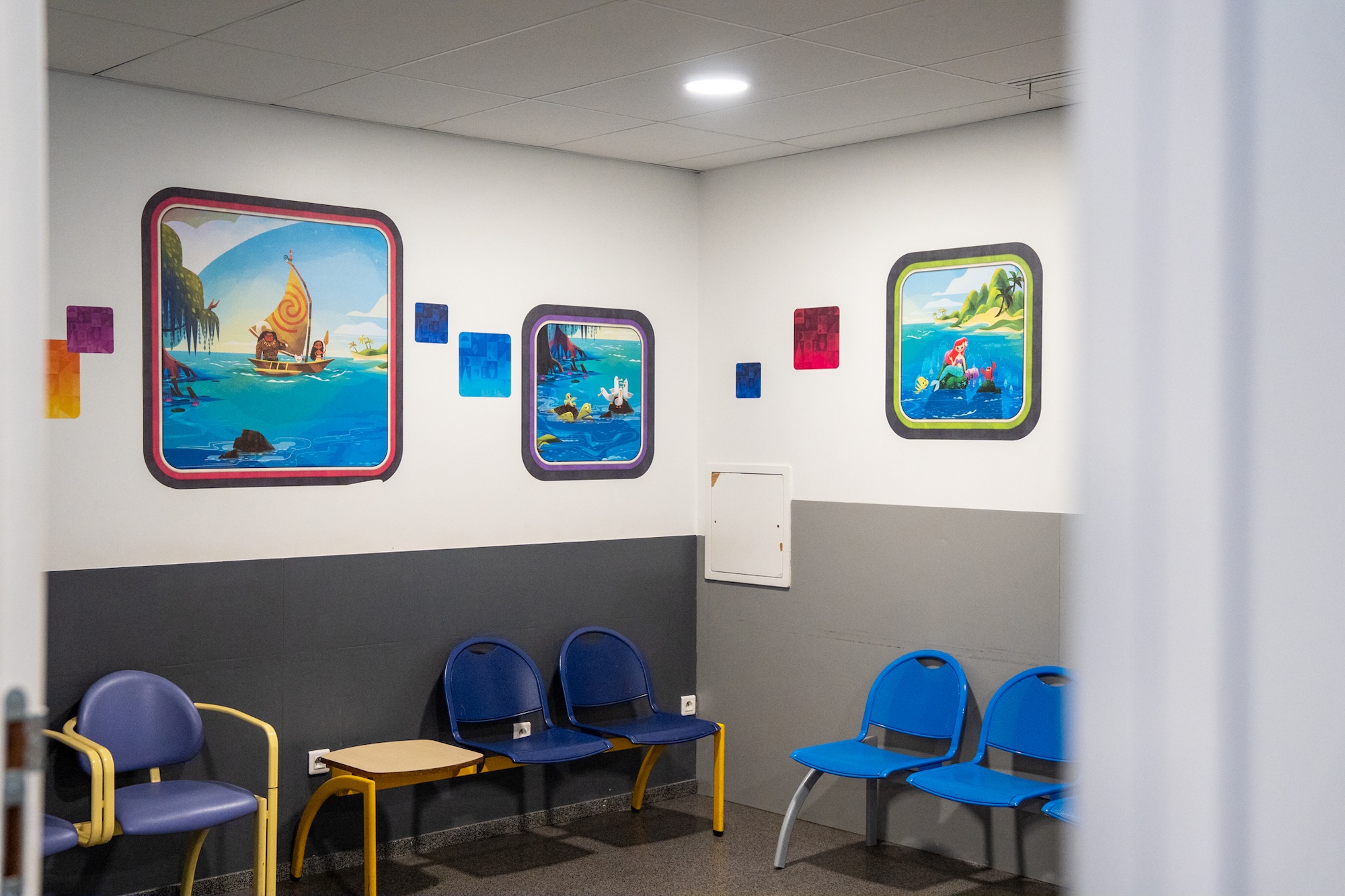 - The decor features a series of murals depicting Disney characters and stories, adapted to the hospital’s spaces, including corridor walls, windows and the medical examination rooms of the pediatric emergency unit.