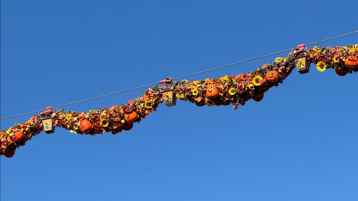 Along with the pumpkins and fall foliage-evoking imagery are some larger pieces too, such as this large pumpkin-topped stalk and a light post with pumpkin and witch-referencing adornments.