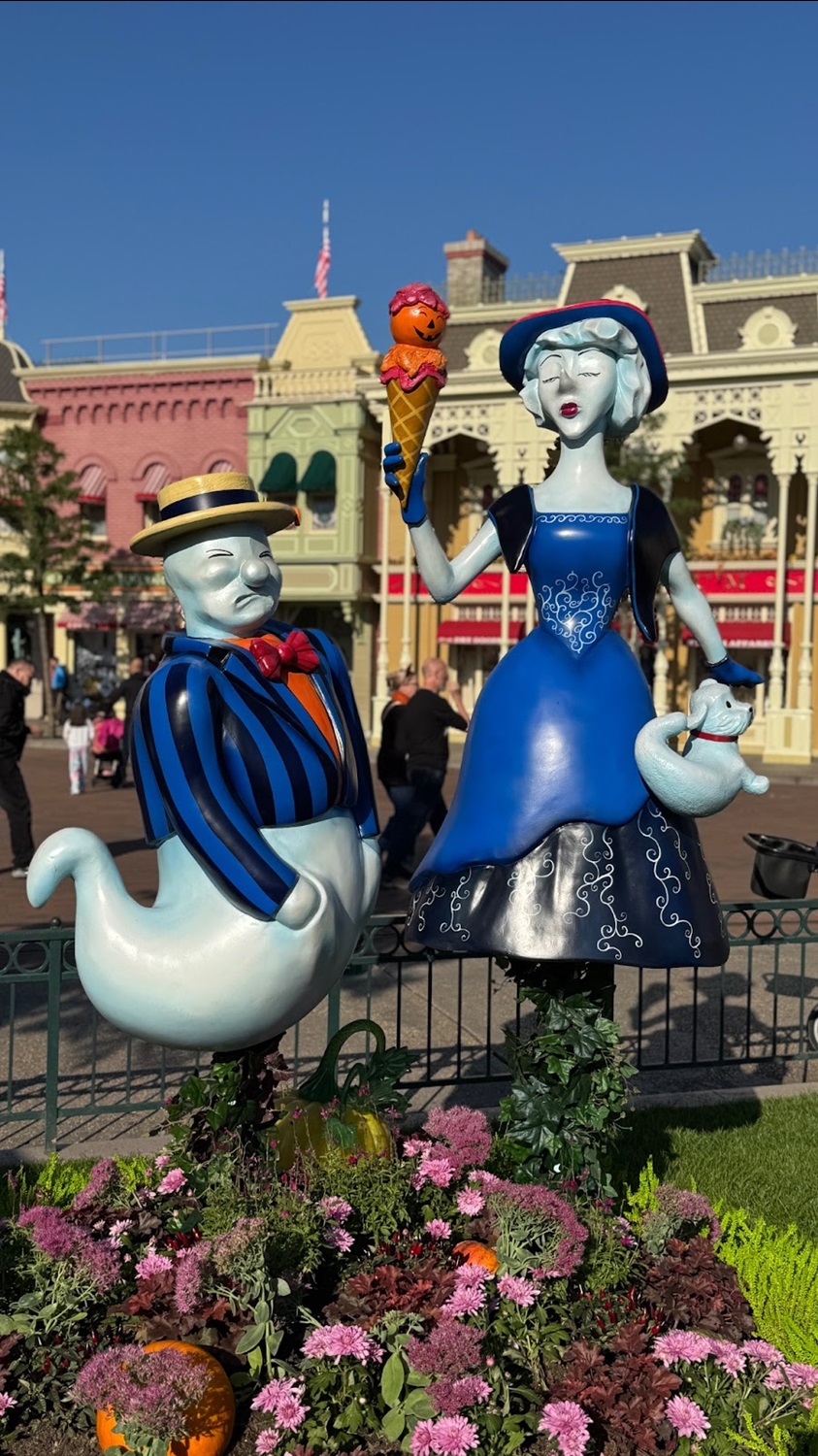 The archways past the entry gates into the park proper feature silhouetted images of familiar Disney characters in their Halloween best. And from there, once you walk into Town Square and the start of Main Street, you begin to see the many ghosts currently occupying the area, including a duo playing a game of spectral baseball.