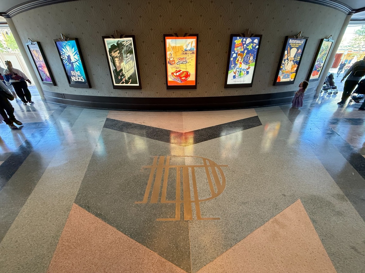 The flooring in the lobby also features a gold inlay “DT," for Disney Theater.