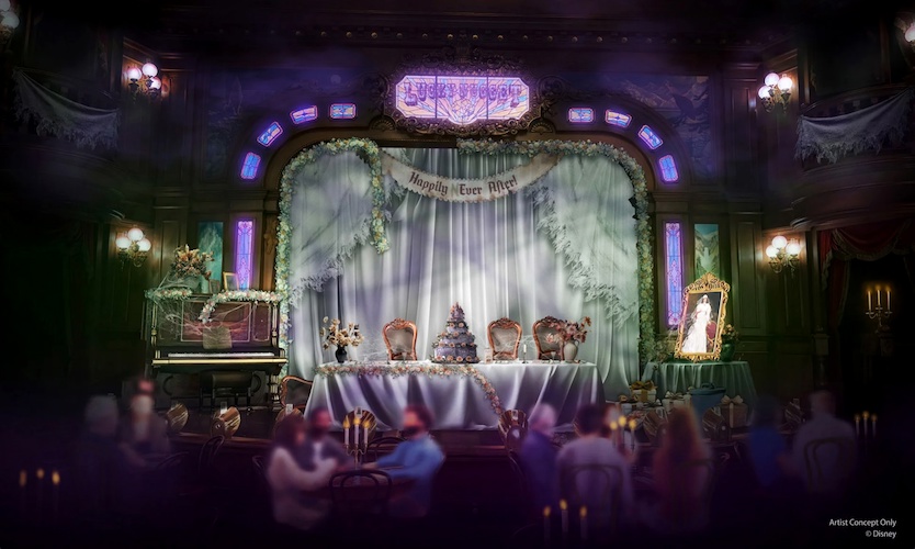 - Disney Imagineer Thomas Levert notes that if you look at the decorations, “The name of Melanie Ravenswood’s groom is never visible. The mystery remains unsolved! In fact, the four menus placed on the main table are a perfect example — the groom’s name is always erased, just like the four vanished suitors."