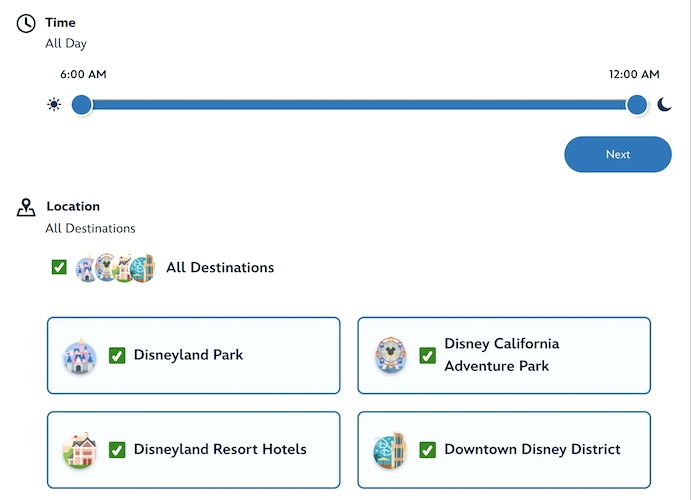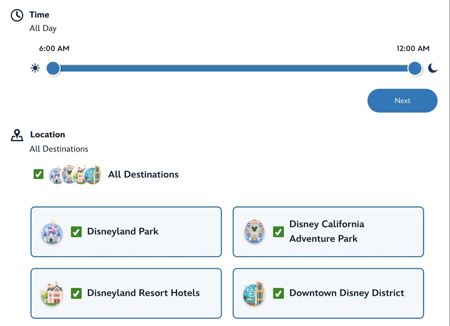 - The system also allows guests to explore restaurant availability on specific days, with new filters allowing guests to select different areas of the resort, including Disneyland Park, Disney California Adventure, the Resort Hotels, and Downtown Disney.