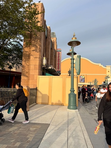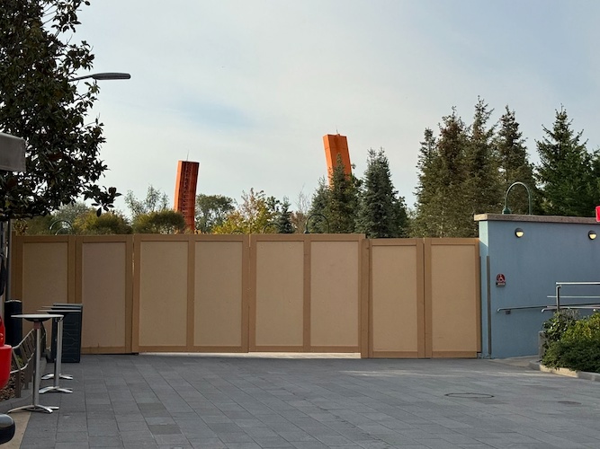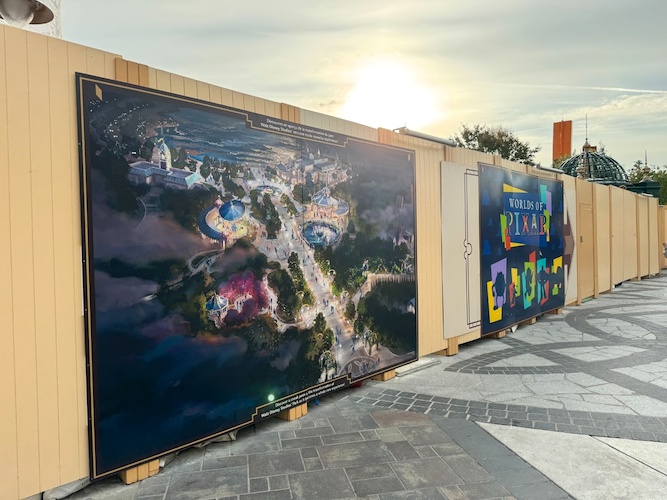 Starting at the perk entrance, walls are up around the back side of the World Premiere building. Concept artwork on the walls depicts the soon-to-be reimagined World Premiere Plaza.