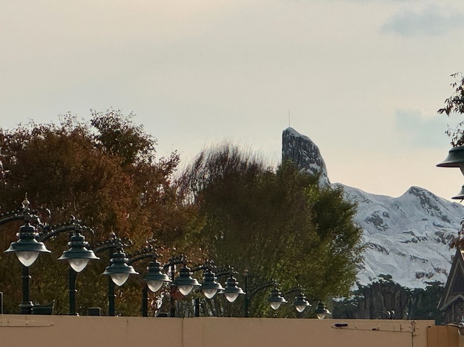 While we can’t see Elsa’s Ice Palace just yet, the North Mountain looks stunning, towering over the park.