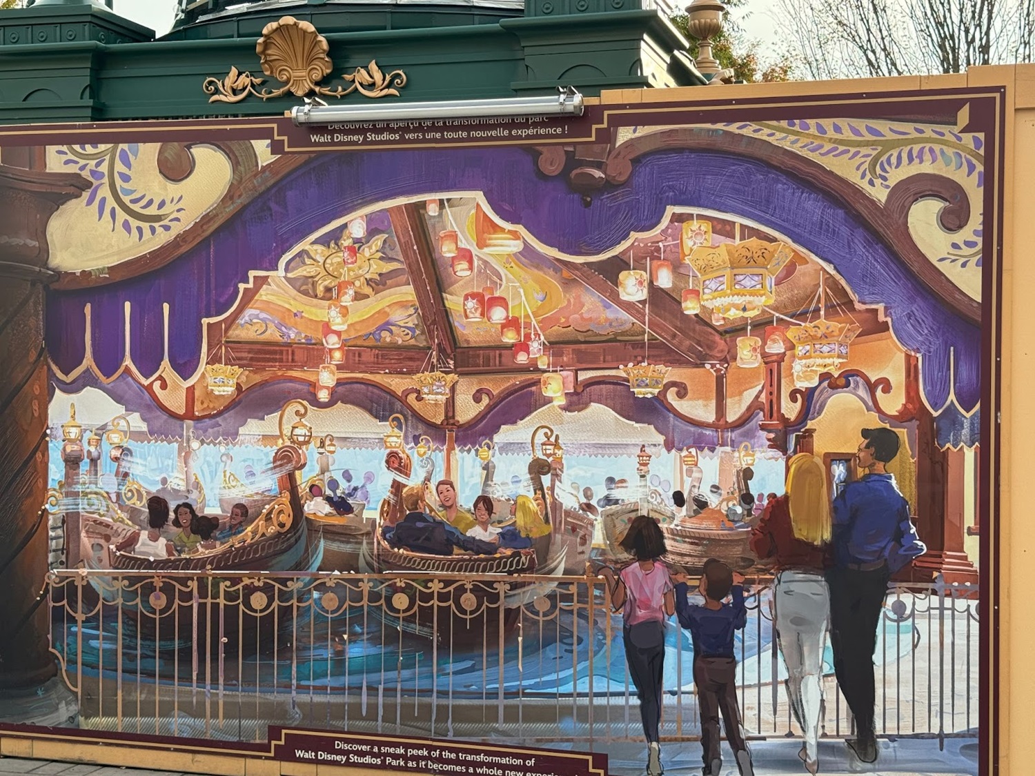 Construction walls around the soon-to-be Adventure Way area of the park show concept artwork for a new Tangled-themed attraction called Raiponce Tangled Spin. We can also see concept artwork for The Regal View Restaurant and Lounge, also coming to Adventure Way.