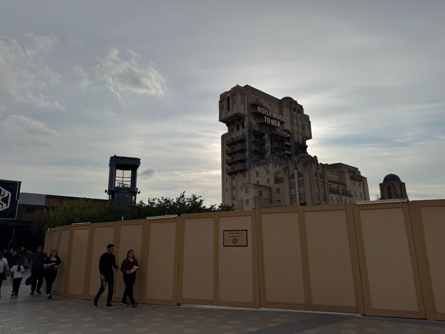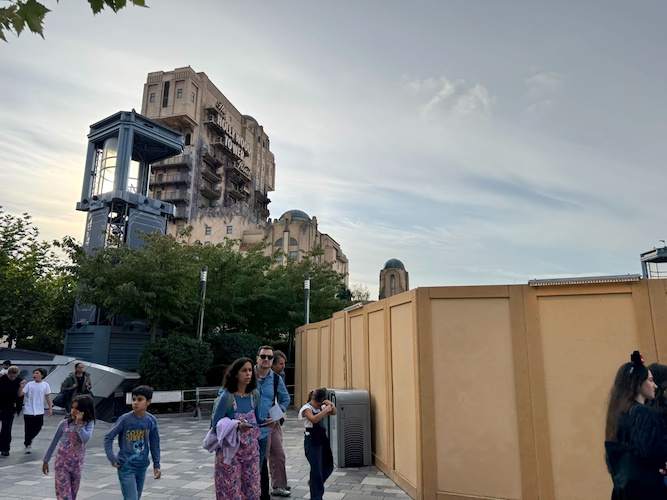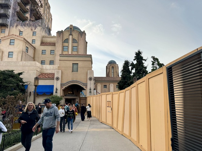 Moving along towards Tower of Terror, construction walls block off the area in front of the attraction, all the way up to the exit of the attraction.