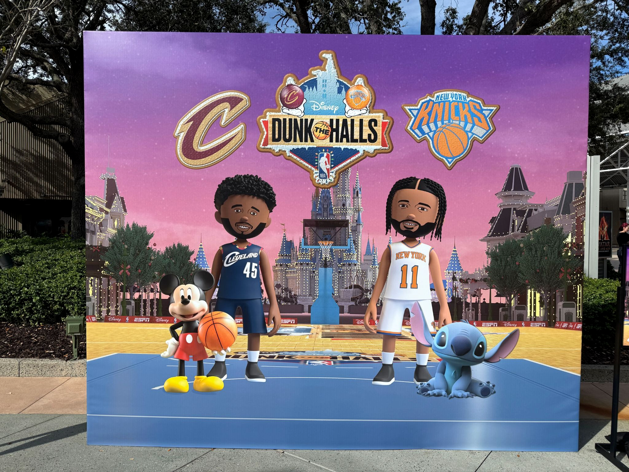 Guests visiting Disney Springs at Walt Disney World can get ready for a new annual tradition with a special new photo op. Celebrating the upcoming Dunk The Halls on Disney+, ESPN2, and more. The new photo spot also features some of the players that will be featured in the holiday game, which features the Cleveland Cavaliers taking on the New York Knicks.