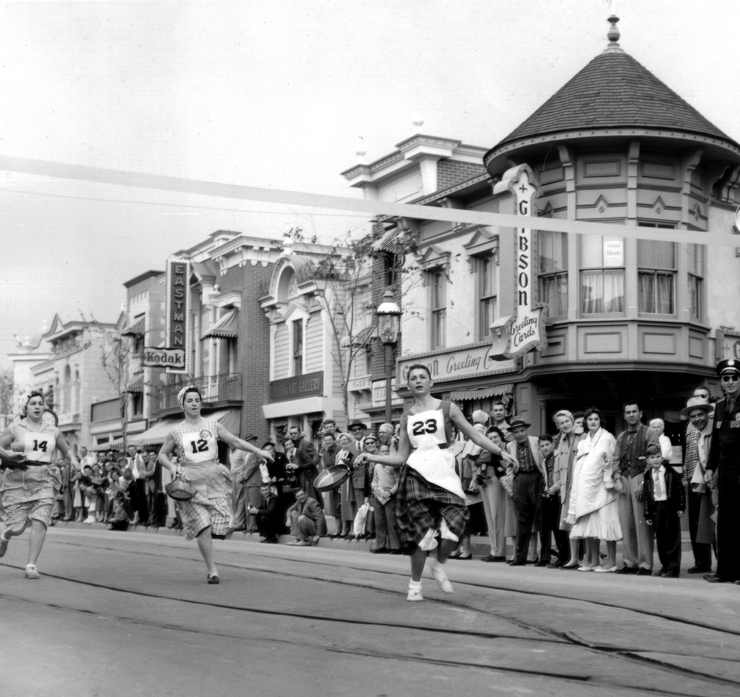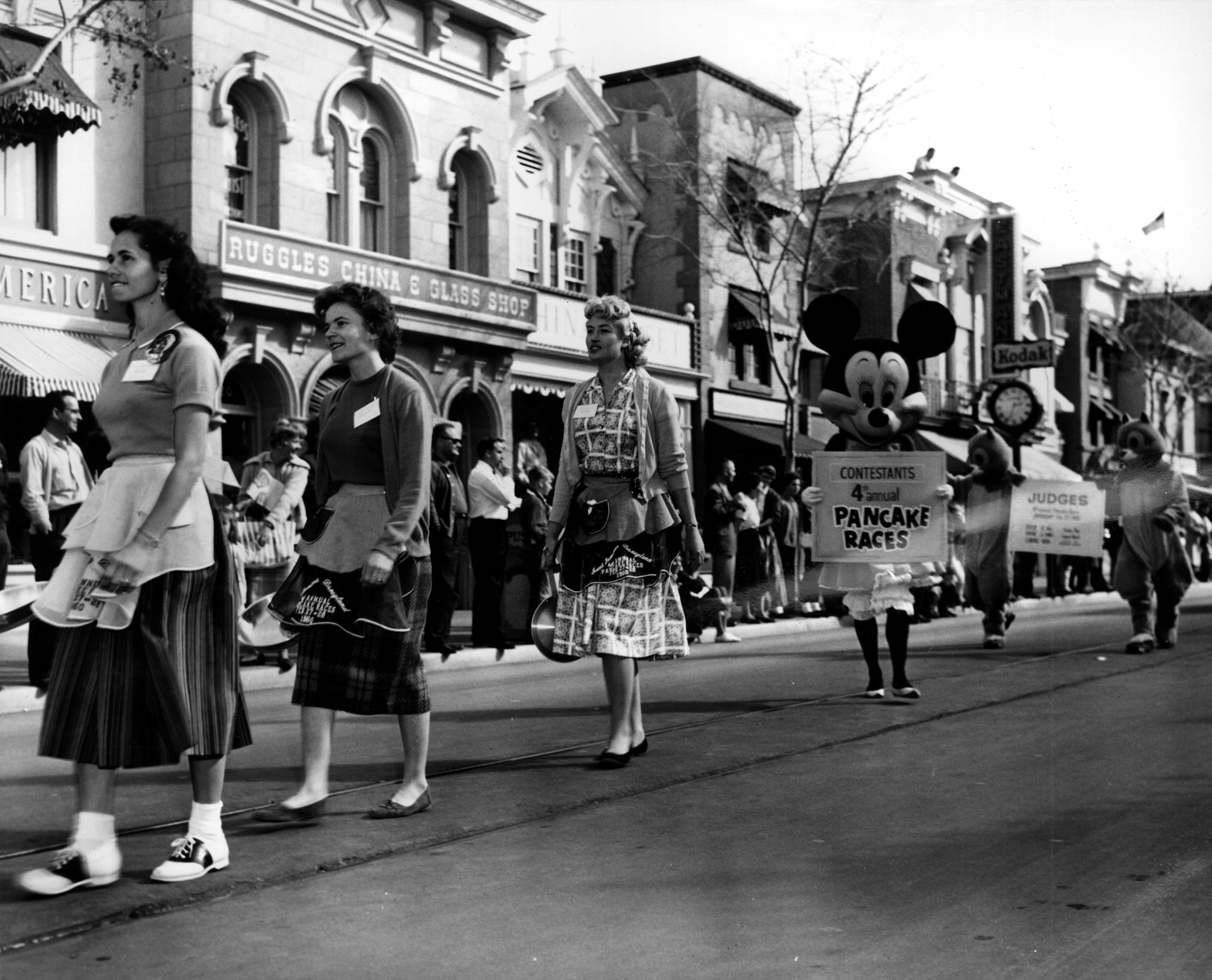 Beginning in 1957 on Disneyland’s main thoroughfare, women qualifiers outfitted in long skirts, sensible shoes, and aprons carried a nine-inch skillet containing one pancake. Four times during the sprint, a contestant had to flip—or fling—her pancake over a stretched ribbon eight feet in the air (similar to the height of a standard regulation men’s volleyball net of the era). If a racer didn’t catch her pancake in her skillet on the other side, she was disqualified. The 415-yard course, which required navigating the area’s streetcar tracks, started in Town Square, traveled down Main Street, U.S.A., and then circled the Central Plaza hub before the finish.