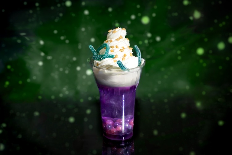 - The delicious treat is a Sprite float with purple shimmer and fruit-flavored boba pearls topped with vanilla soft-serve, gold star sprinkles, and blue raspberry sour straws.