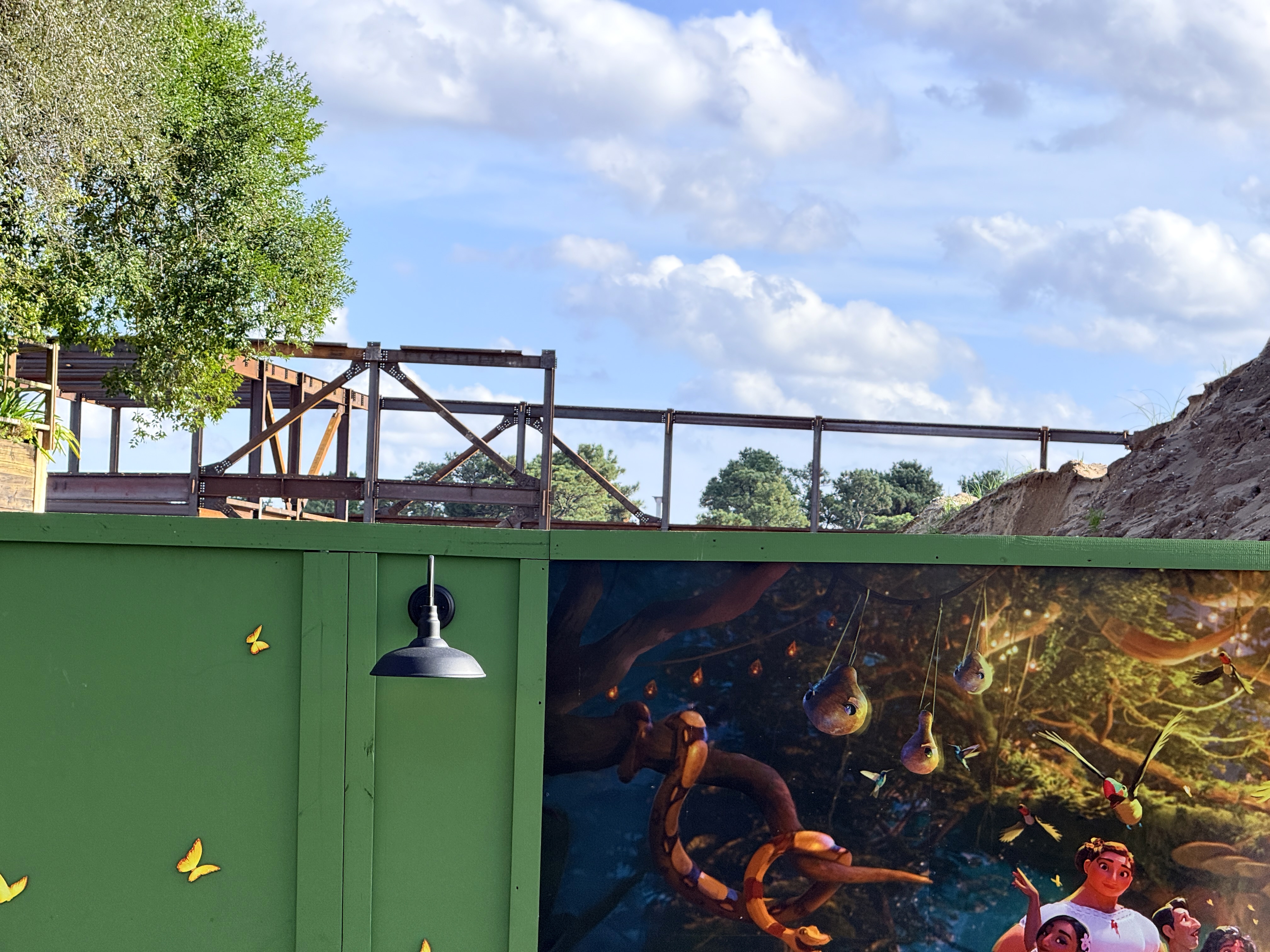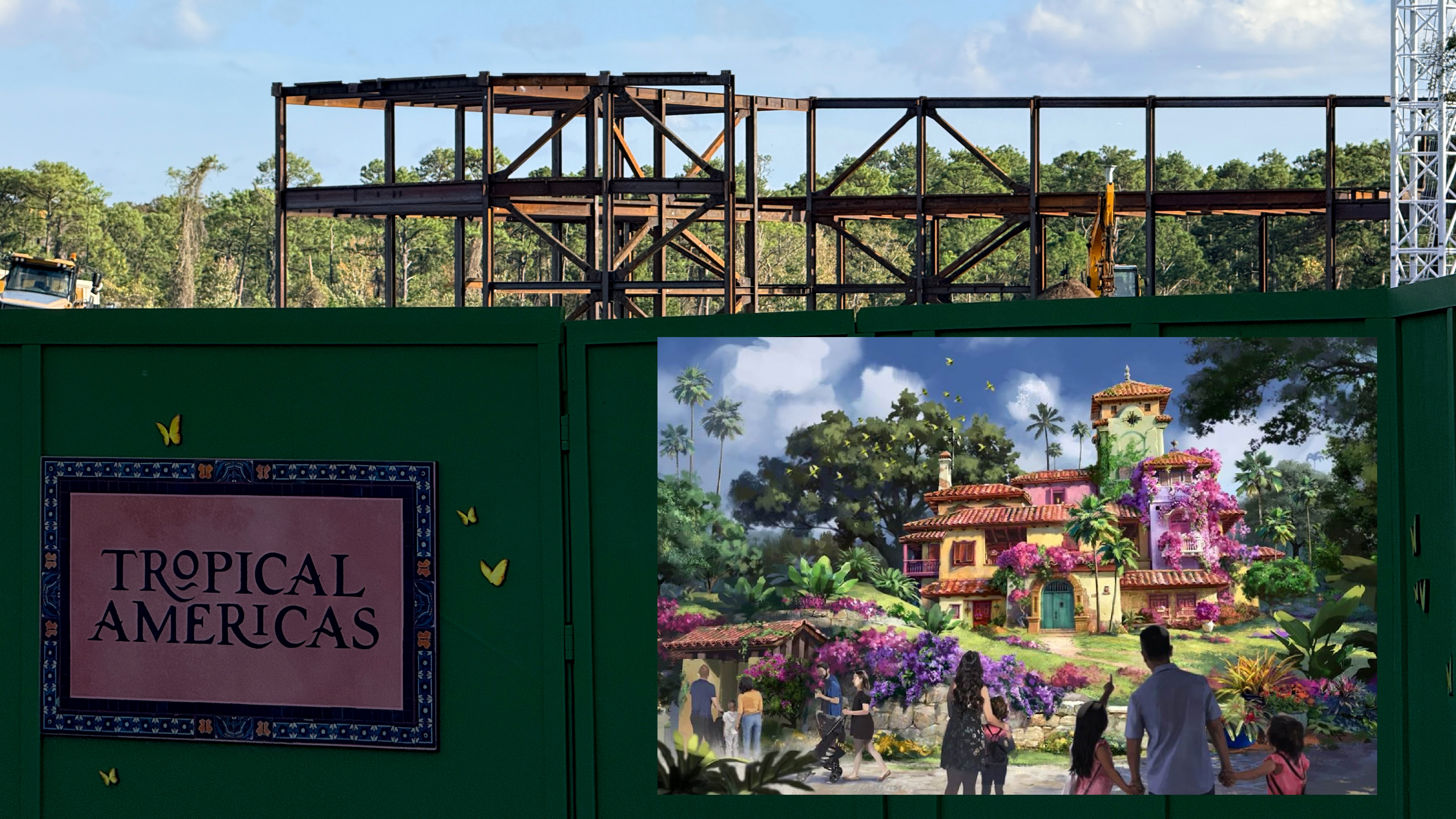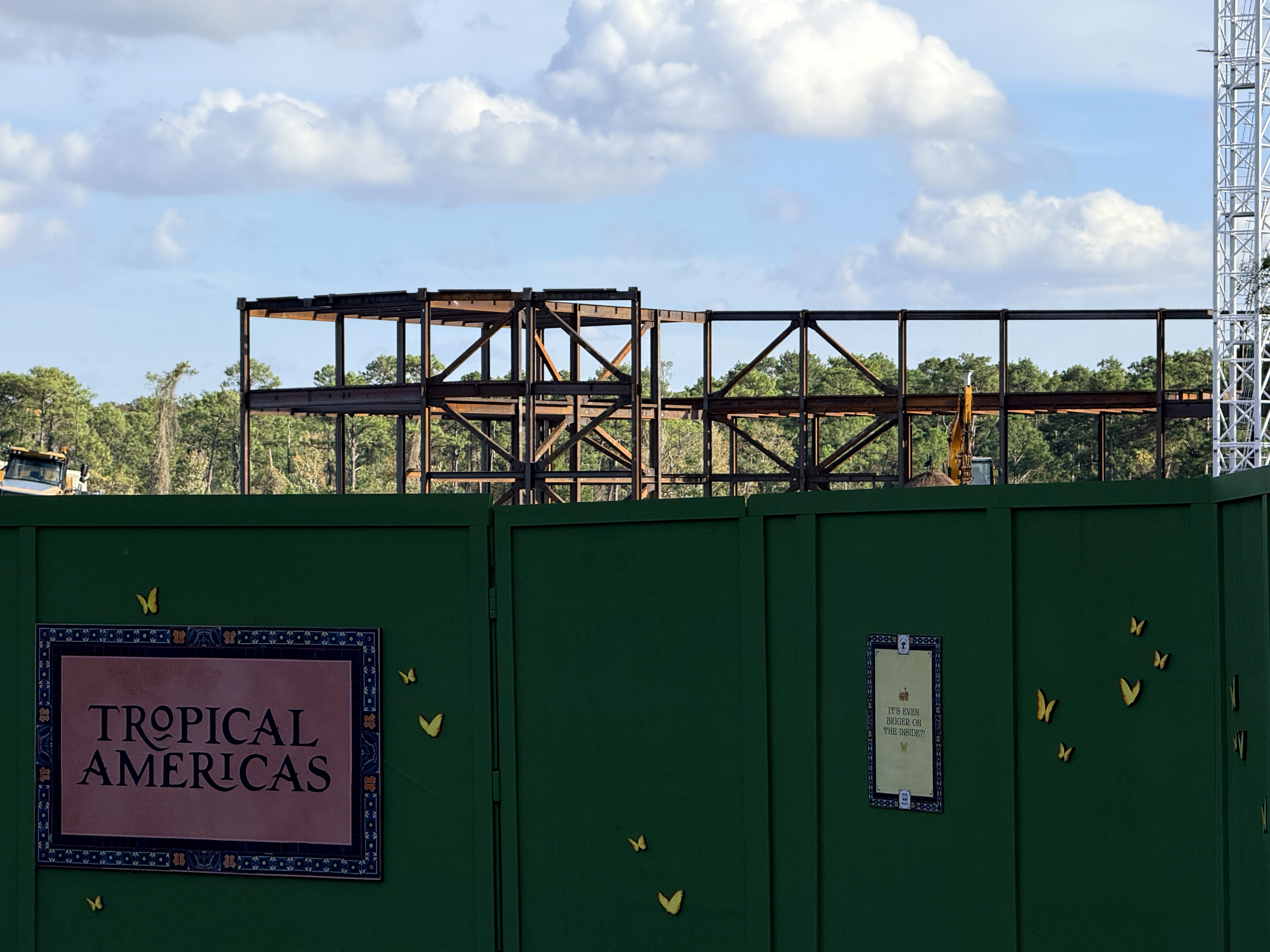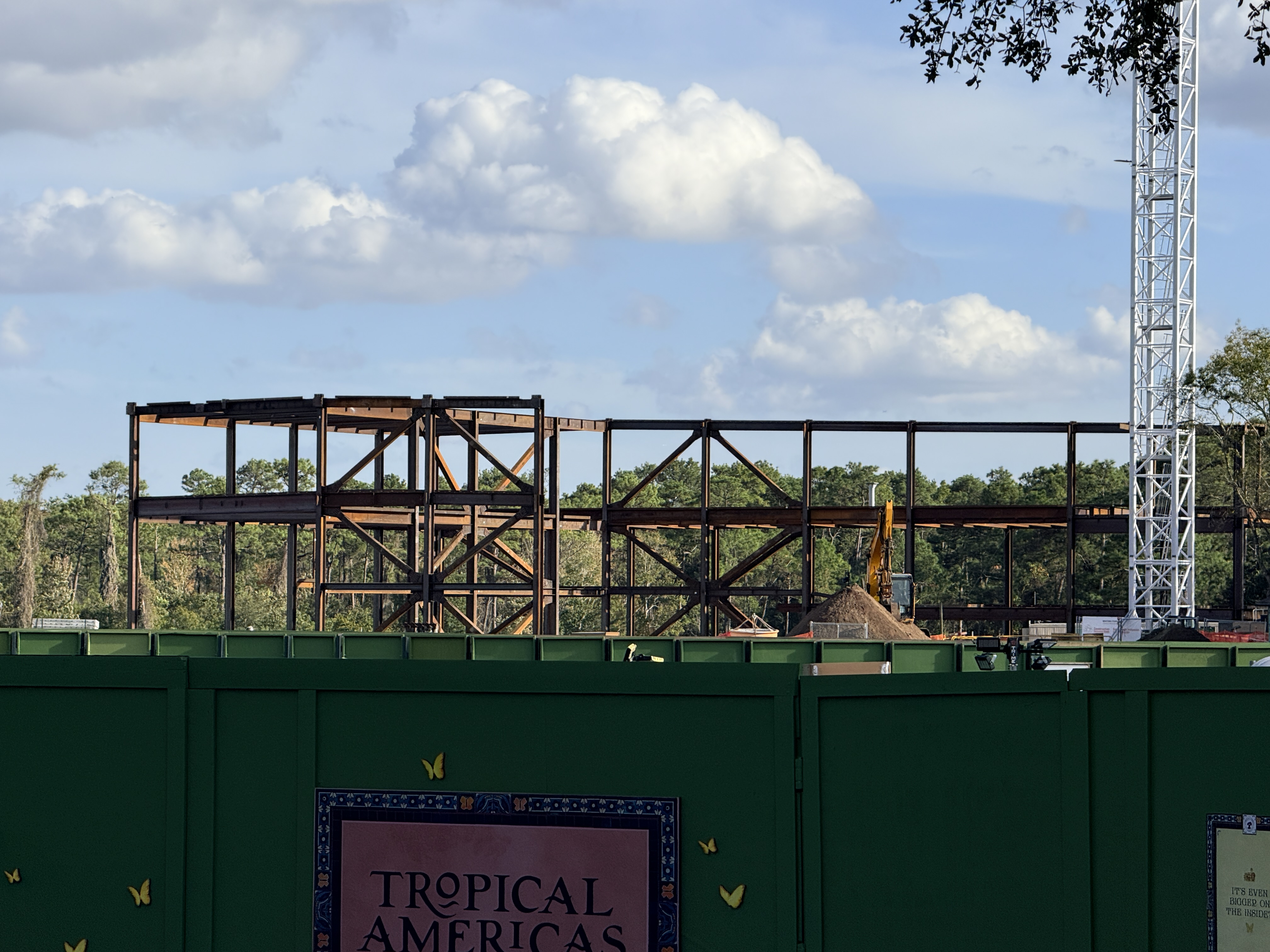 It was only two weeks ago when Disney revealed that vertical construction had begun on the Encanto attraction coming to the Tropical Americas expansion at Disney's Animal Kingdom. In the time since then, construction has progressed at a rapid pace, with the steel framing of the attraction's show building clearly visible from within the current DinoLand U.S.A.