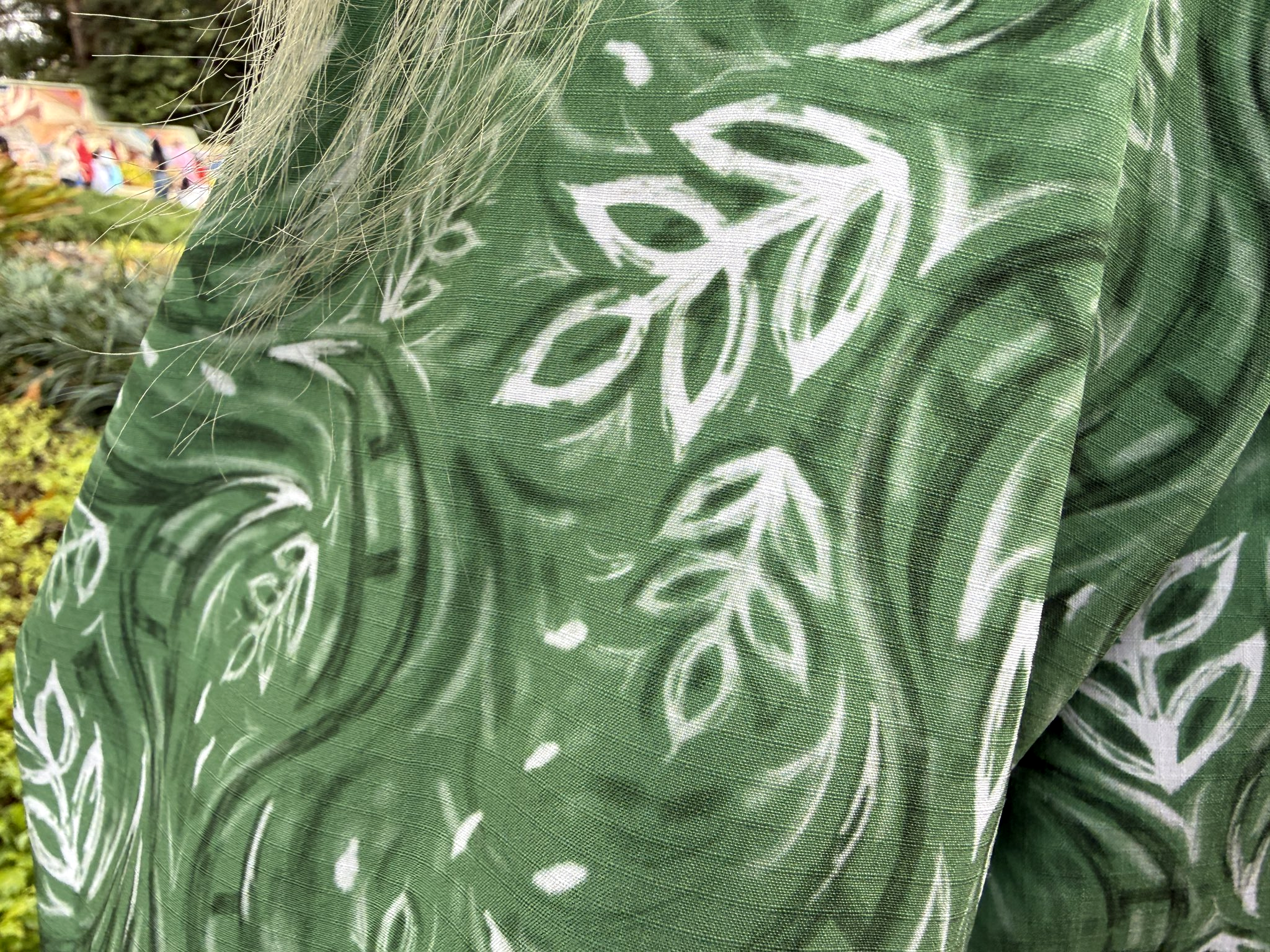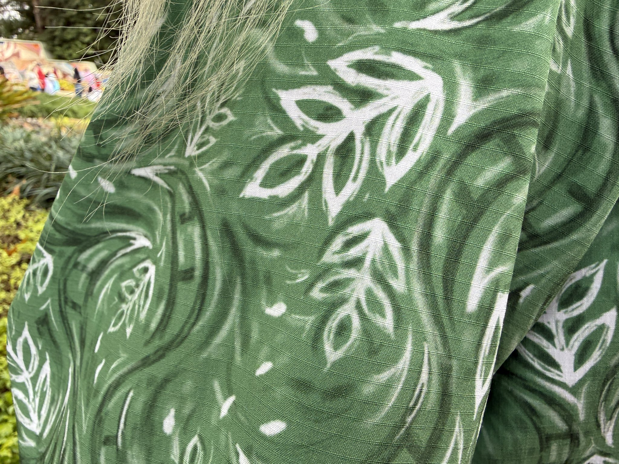 - Paying homage to the area’s pavilion logo, the button up features a really interesting painting-looking green and white design, with leaves incorporated all over the shirt.