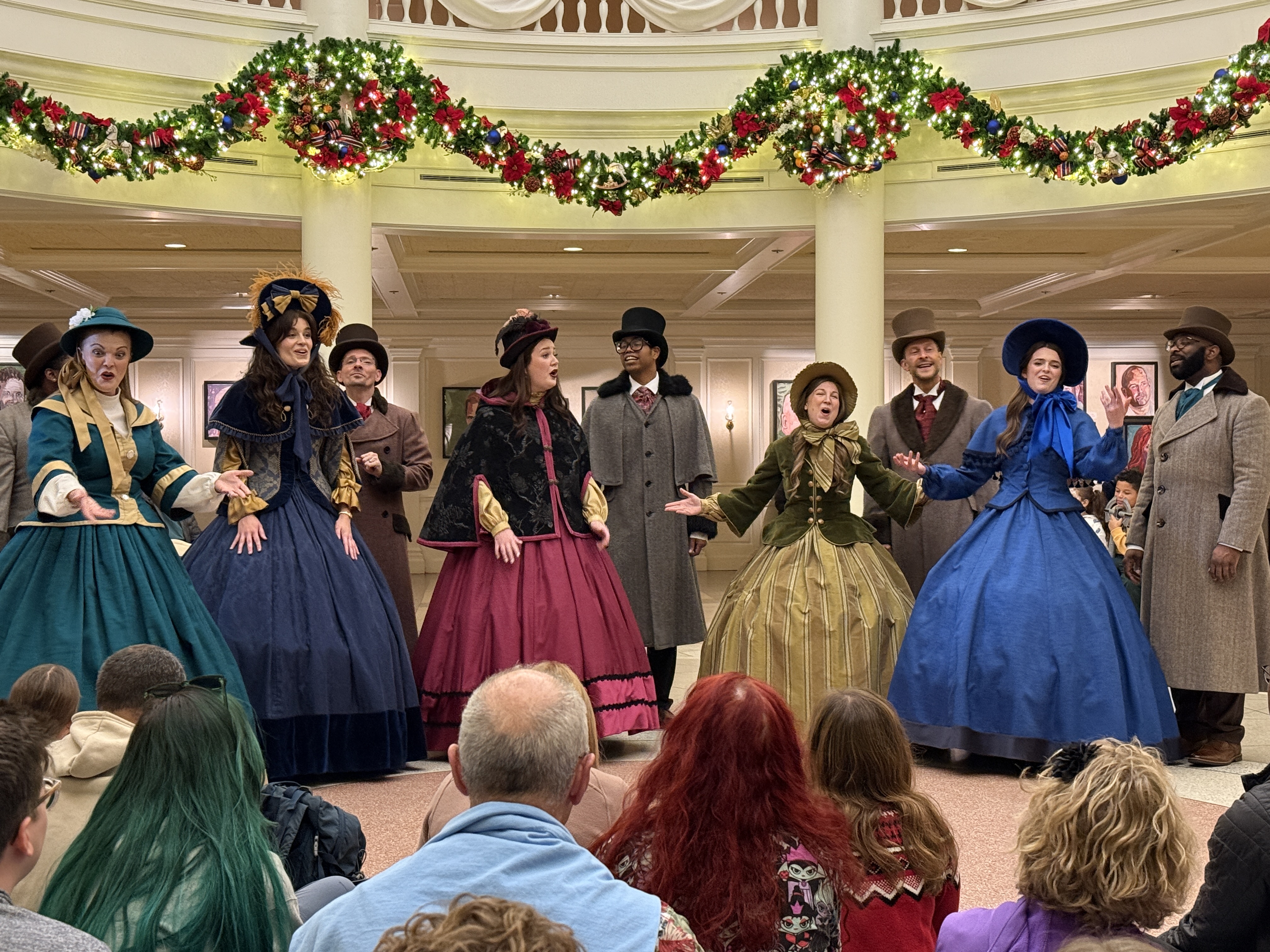 Over at The American Adventure, the Voices of Liberty are dressed as Dickens Carolers as they perform beautiful versions of perennial holiday favorites.