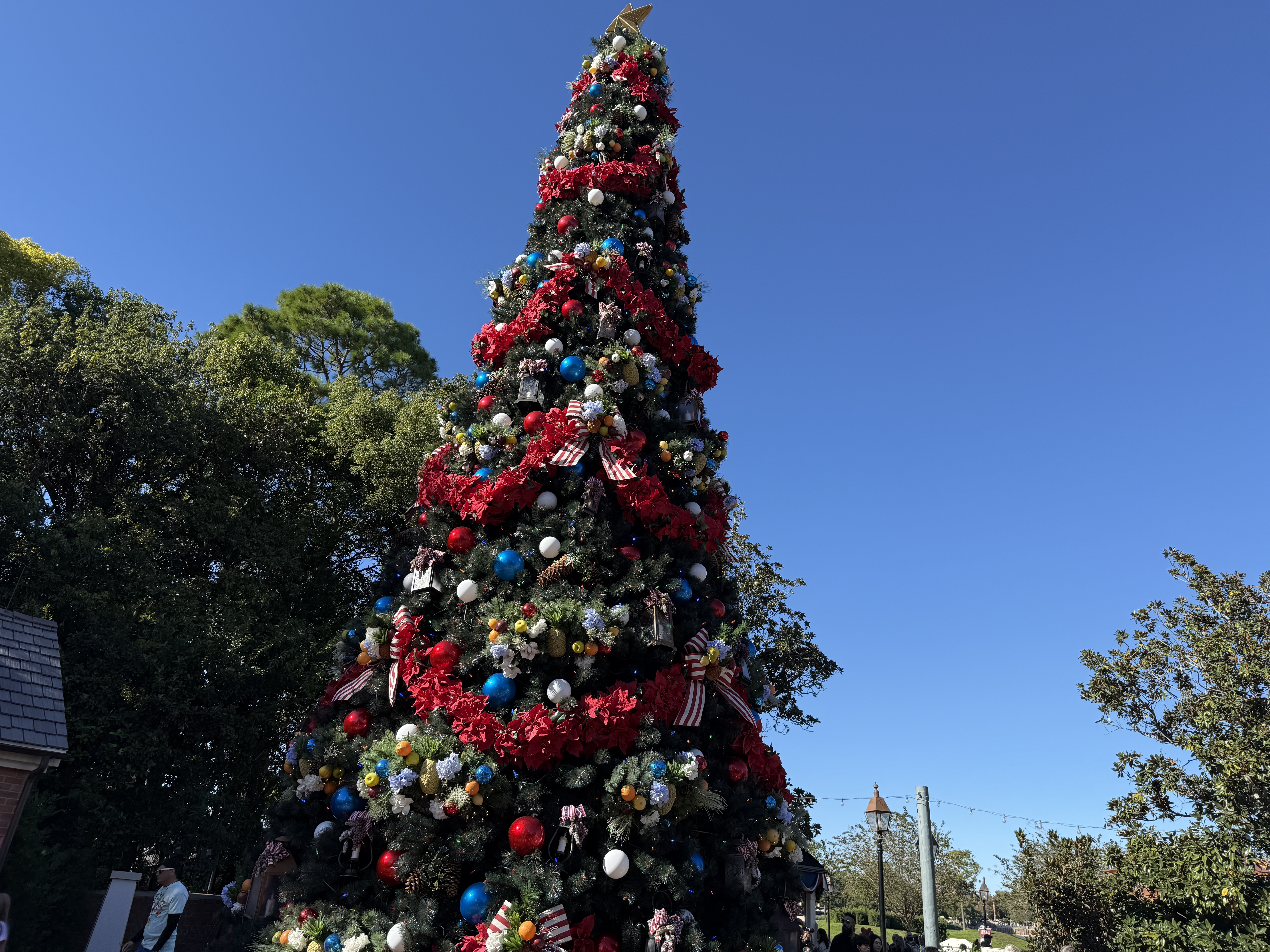 Outside in The American Adventure, a beautiful Christmas tree stands tall next to the American Holiday Table food booth.