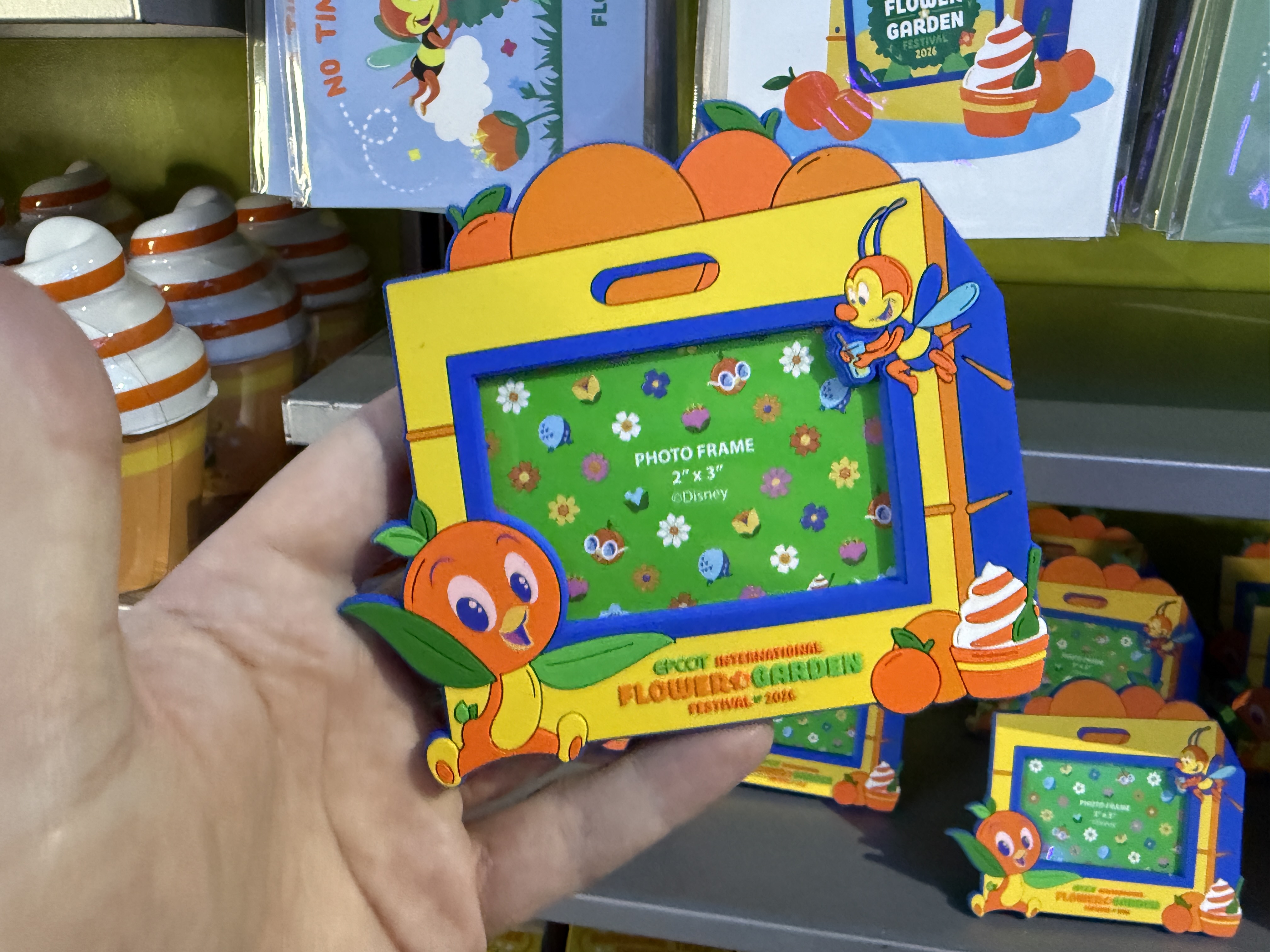 A sculpted mug takes on the EPCOT International Flower & Garden Festival with a Dole Whip-esque look, and can be picked up for $24.99. Orange Bird also is featured on a notes holder that looks like an Orange crate for $16.99. That same look carries over to a fun photo frame as well for $16.99