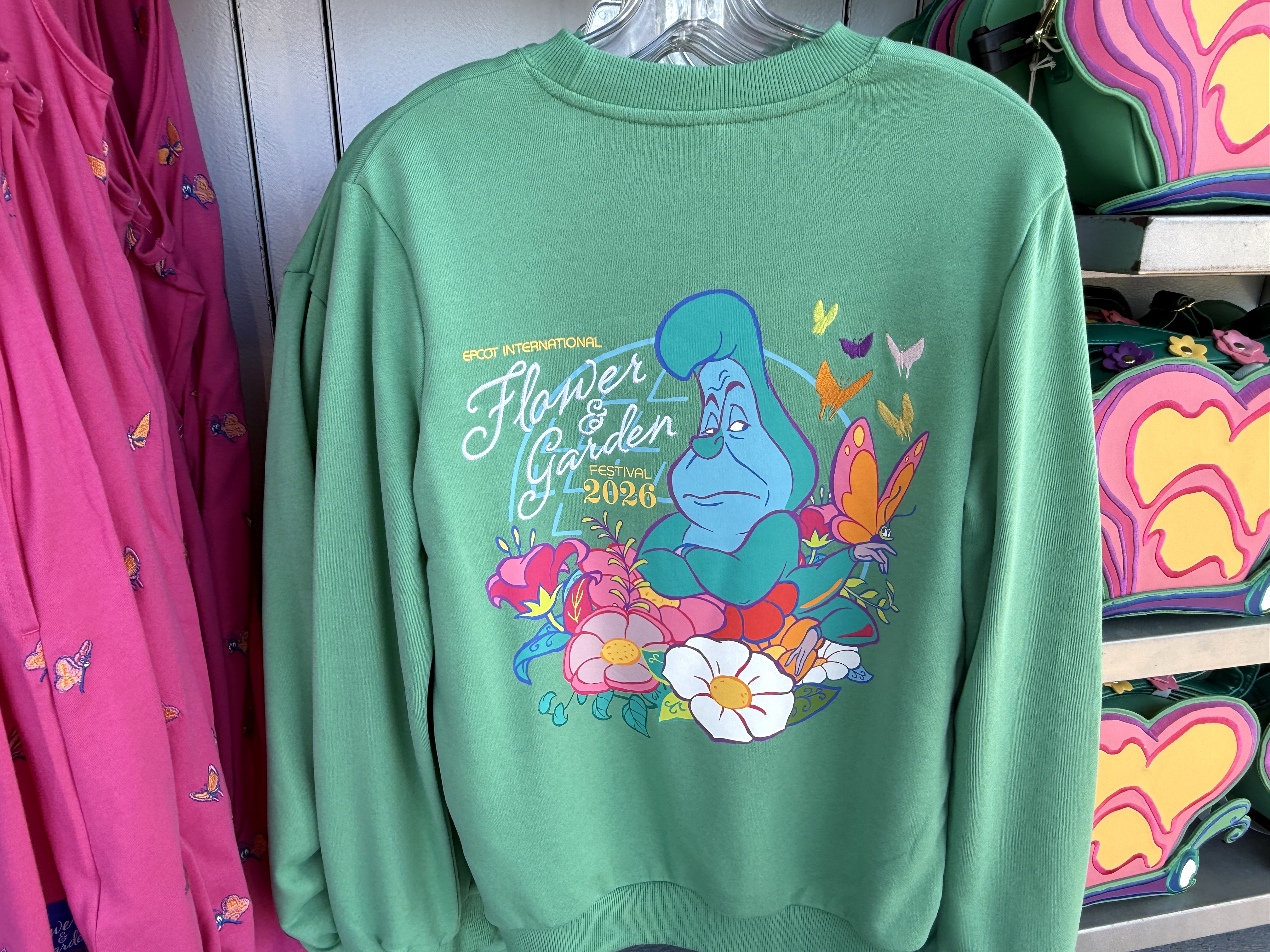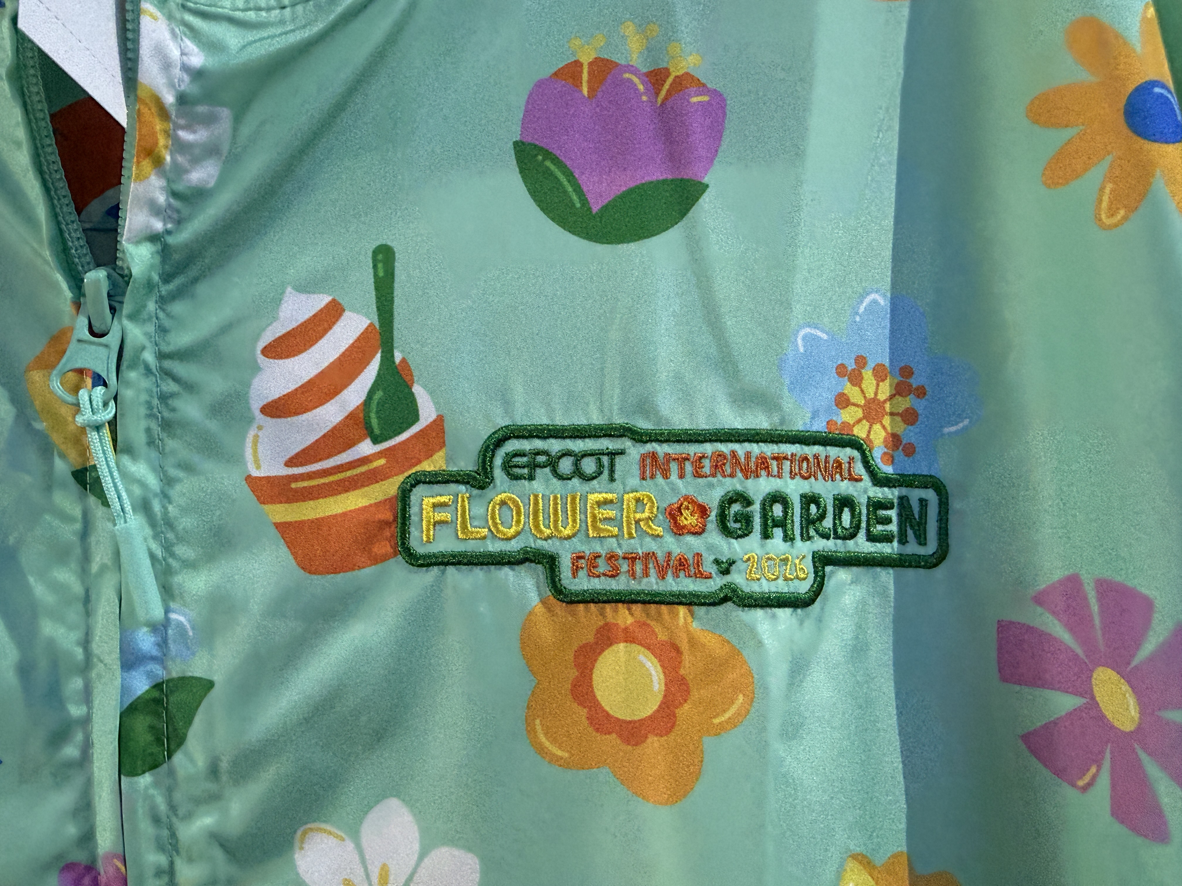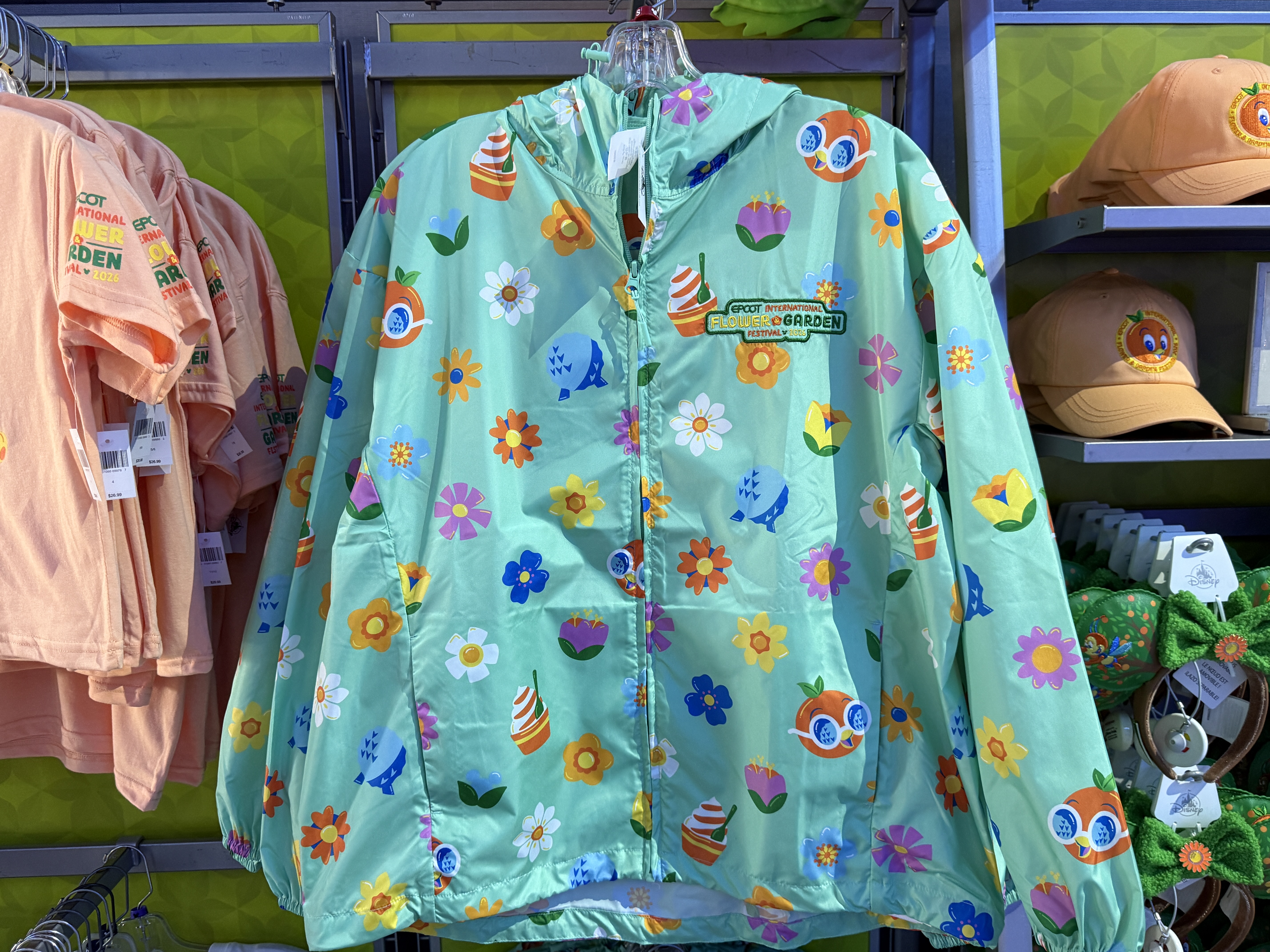 To keep out of those spring showers, a lightweight jacket can be picked up for $59.99, decked out in floral and EPCOT-themed imagery.