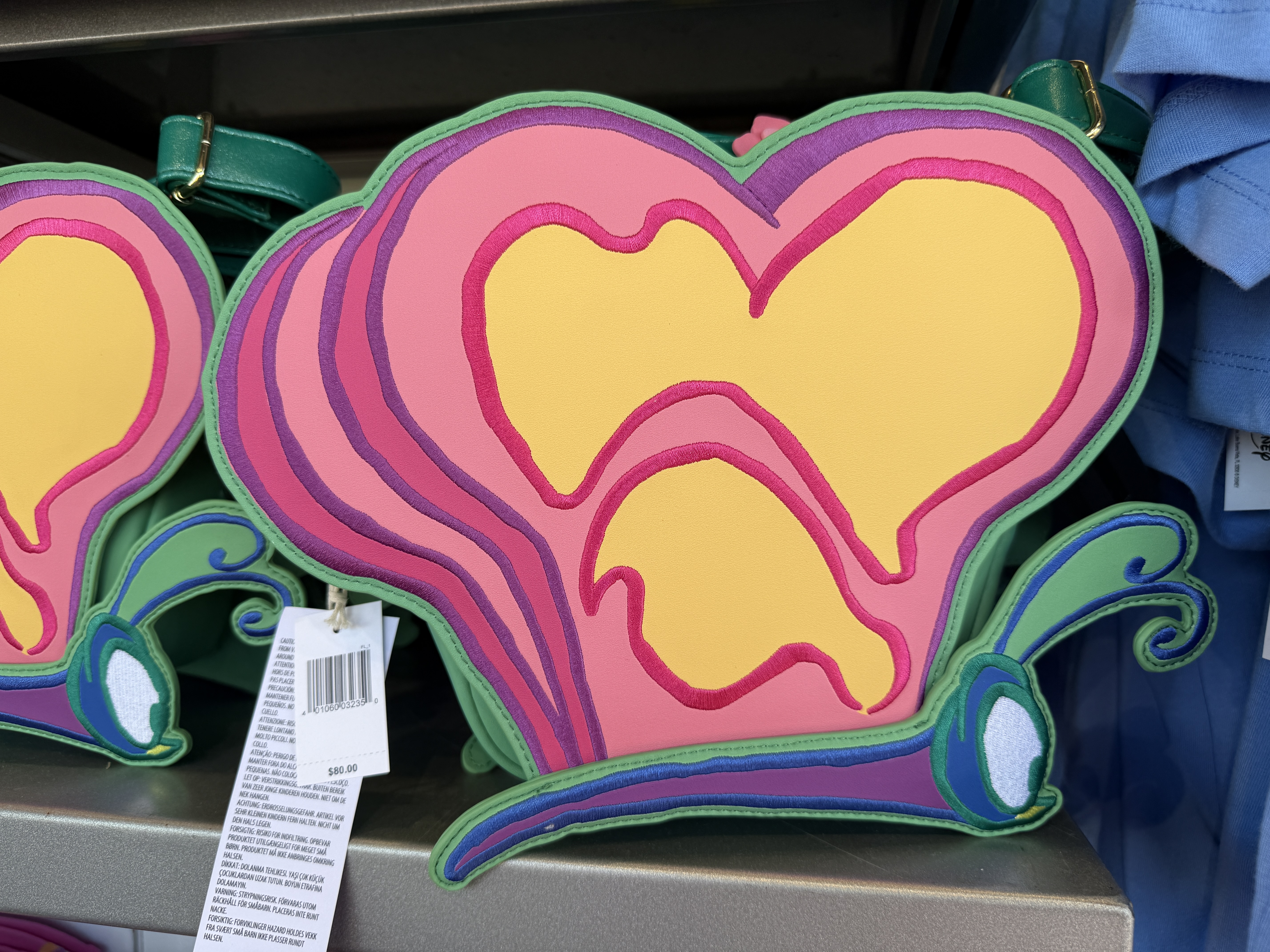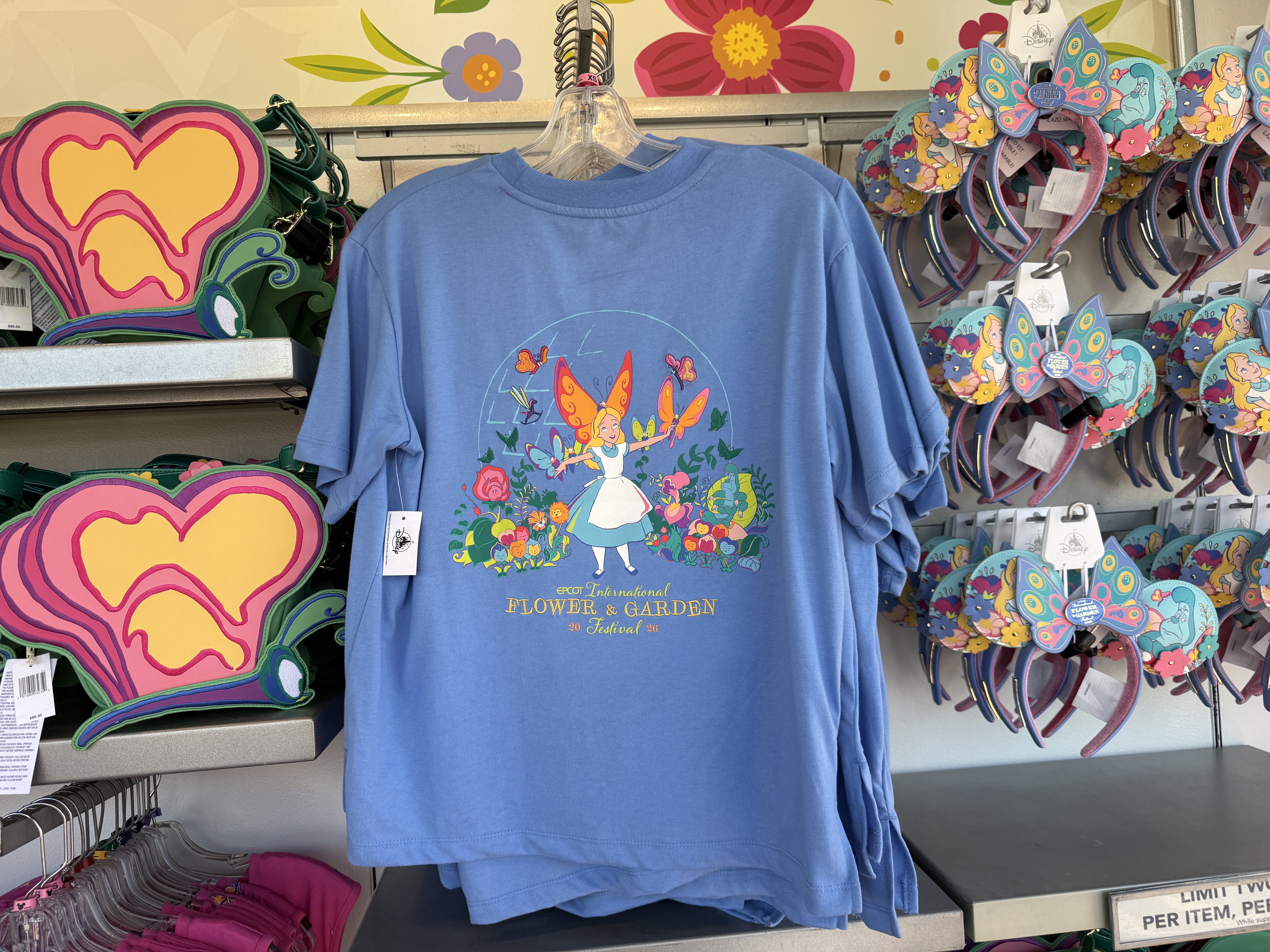 Alice is also featured on a new Flower and Garden Loungefly bag. Caterpillar takes center stage on a new pullover sweater, which retails for $80.00. The Bread & Butterflies from the film are also featured on a sleeveless shirt for $49.99.