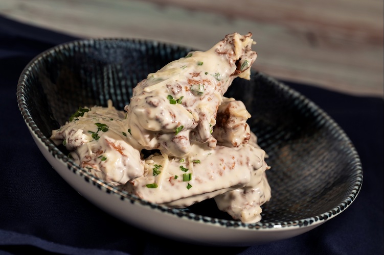 - Buffalo-style Dumplings: Chicken dumplings with buffalo sauce, celery root purée, blue cheese cream, crumbled blue cheese, shaved carrot, and micro celery (New)