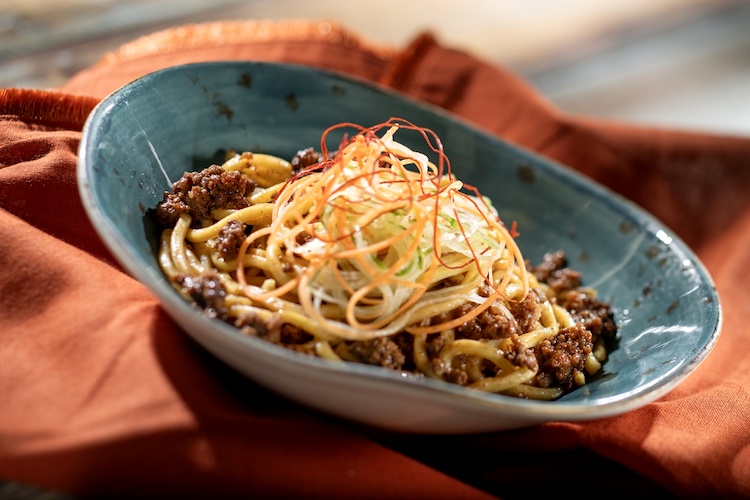- China – Beijing Zhajiang Noodles with stir-fried minced beef, cucumber, chili, and carrots in a savory douban sauce
