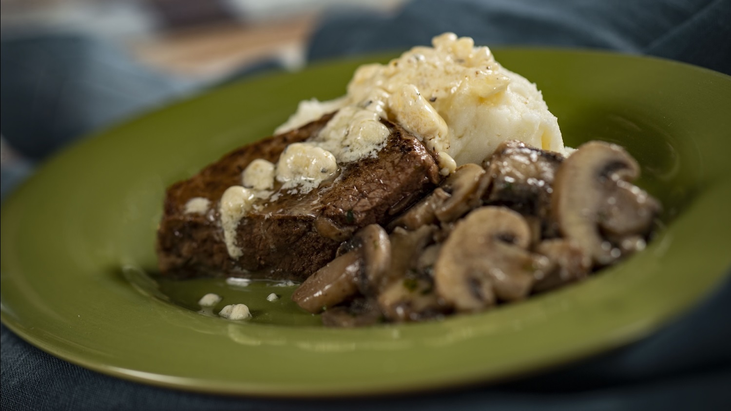 - Filet Mignon with mushrooms and mashed potatoes featuring Boursin Garlic & Fine Herbs Cheese