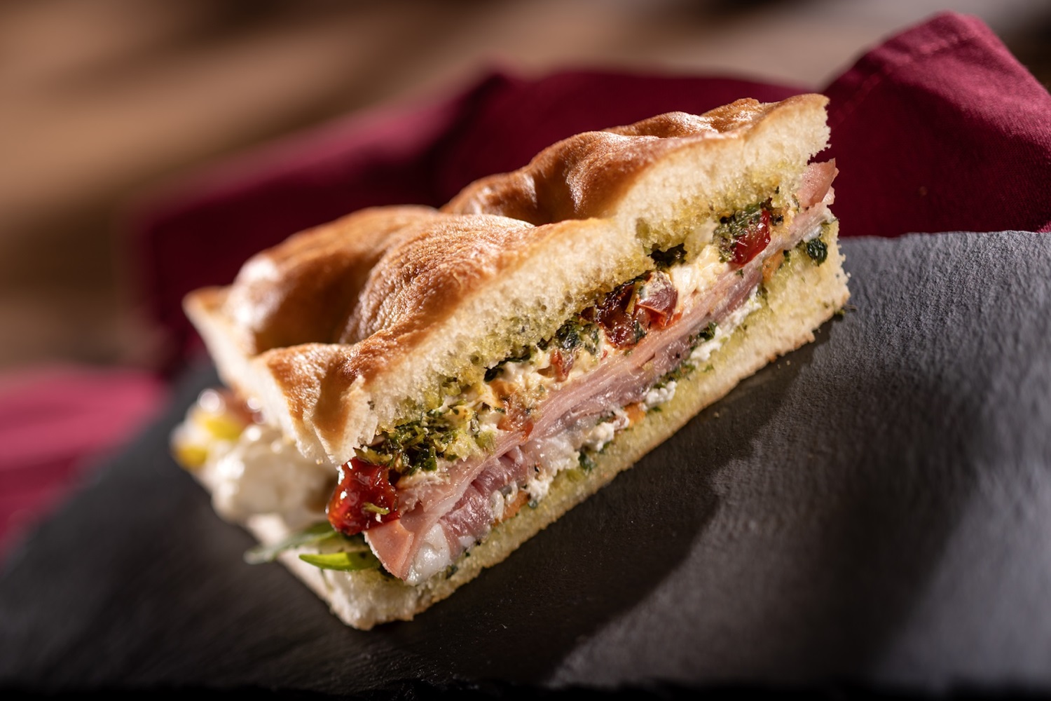 - Schiacciata Sandwich: Mortadella, prosciutto ham, sun-dried peppers, arugula, stracciatella cheese, fall squash mostarda, and pistachio pesto on warm focaccia (New)