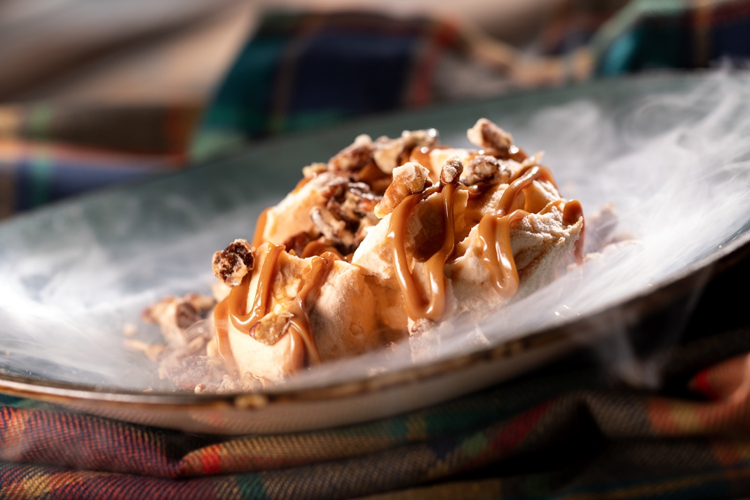 - Liquid Nitrogen Frozen Pumpkin Cheesecake Mousse featuring Philadelphia Cream Cheese with candied pecans and maple-caramel sauce (New)