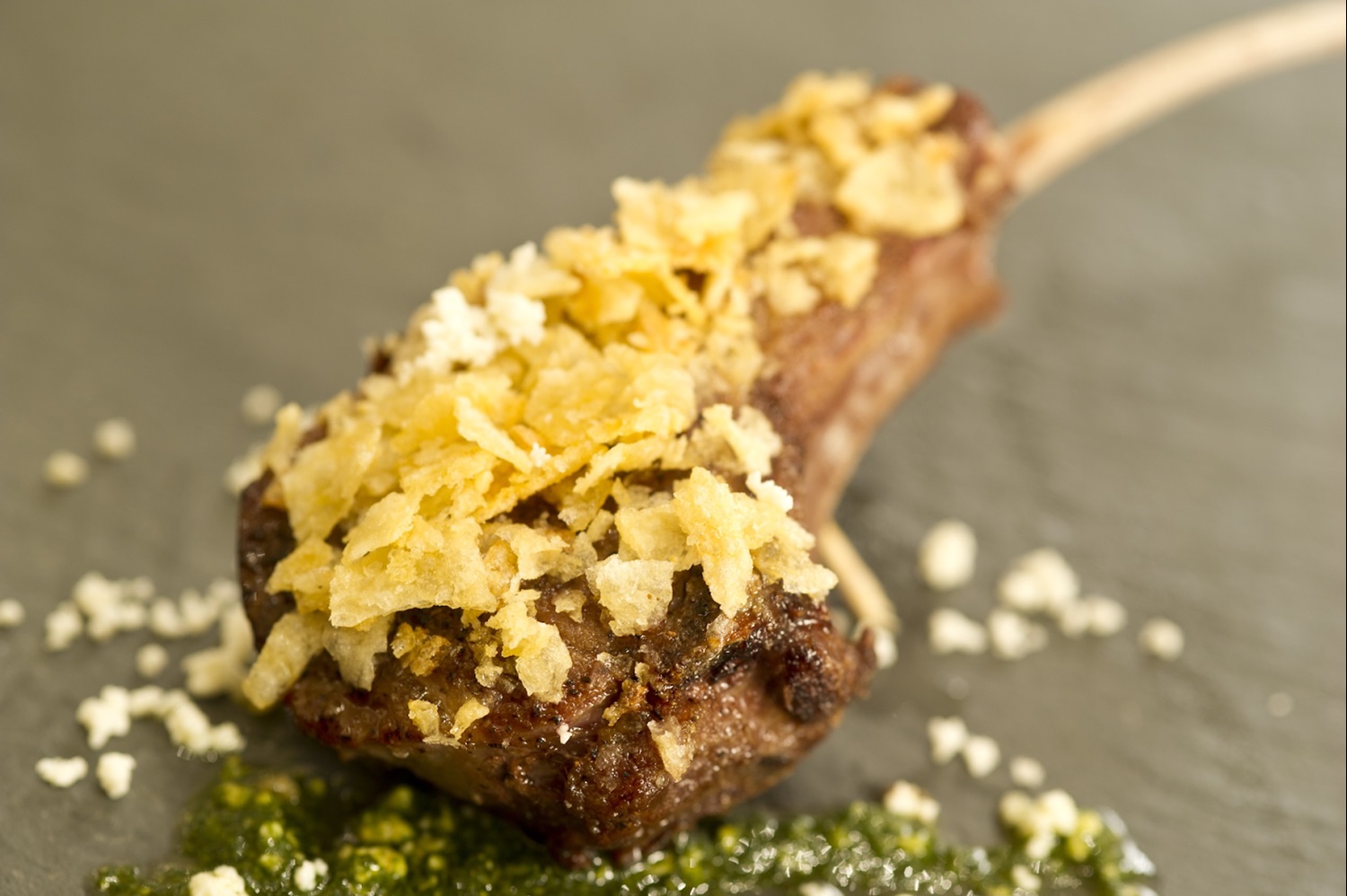 - Roasted Lamb Chop with mint pesto and crushed salt and vinegar potato chips
