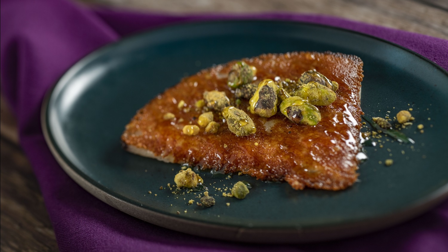- Pistachio Cake with cinnamon pastry cream and candied walnuts
