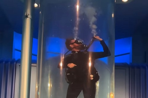 - The demonstration allows divers to show guests how they use air tanks underwater to breathe with a cast member outside the chamber to inform and interact with guests.