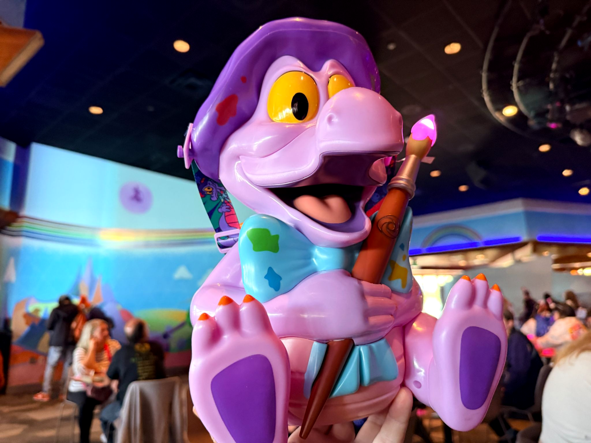 For the 2026 festival, Figment is dressed to impress in an artist’s beret, complete with a charming bow tied around his neck. A large, light-up paintbrush, complete with the Imagination Pavilion logo, adds an extra pop of color and glow, making the bucket as eye-catching at night as it is during the day.