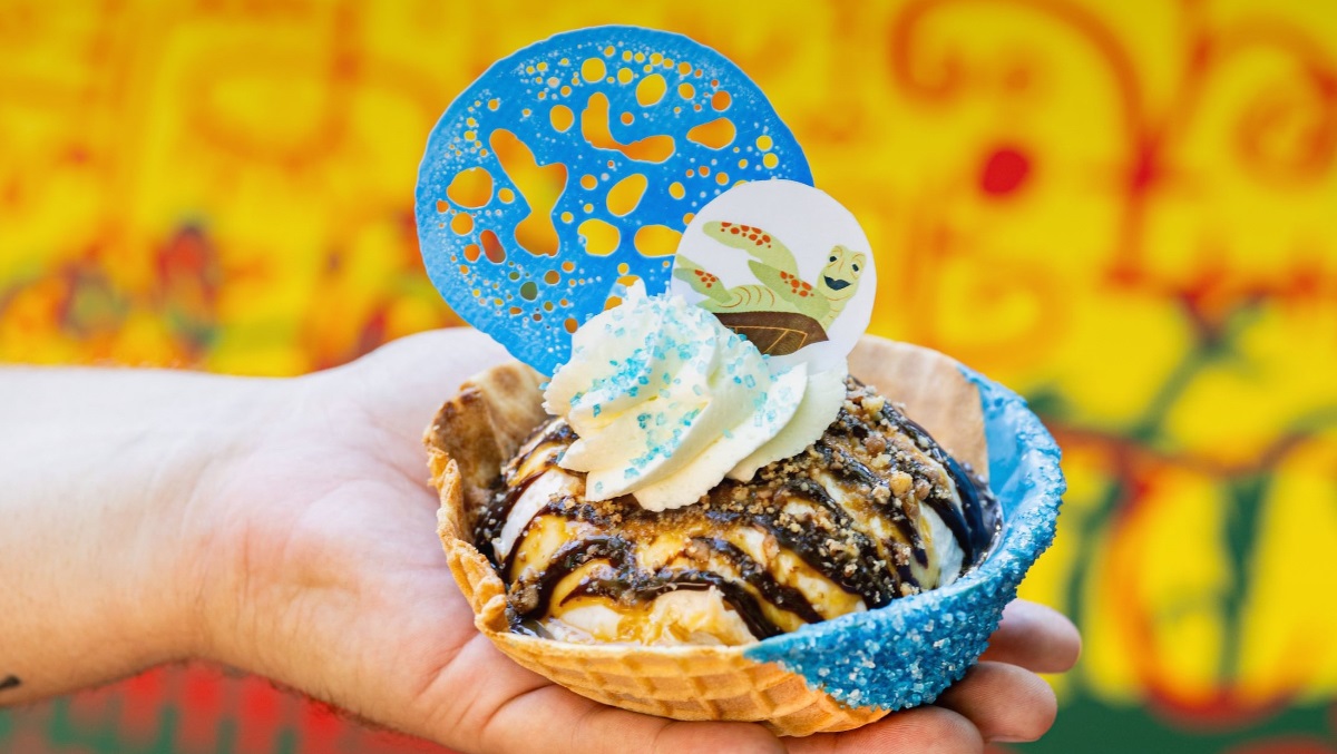 - Over at Dino-Bite Snacks, you can enjoy a tasty tribute to Crush with the Totally Sweet Sundae (seen above). This decadent dessert features Butter Pecan Ice Cream topped with Hot Fudge, Caramel, Candied Pecans and Whipped Cream. It’s garnished with Sea Blue Sugar and served in a White Chocolate-dipped Waffle Bowl.