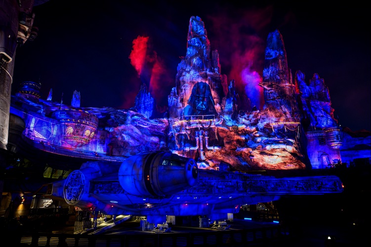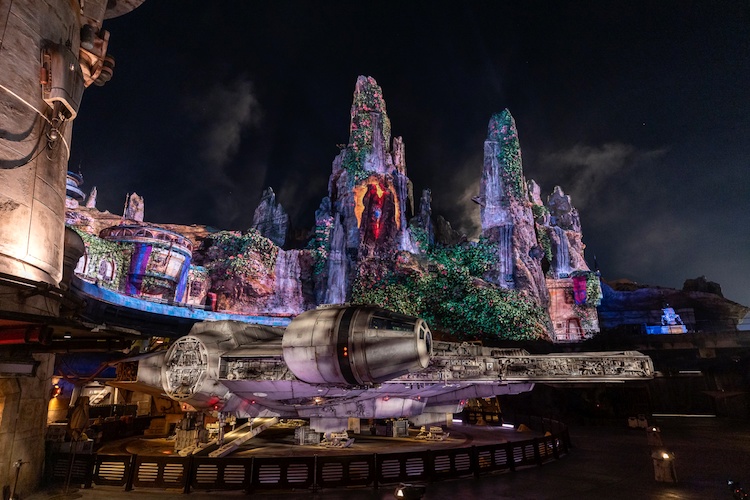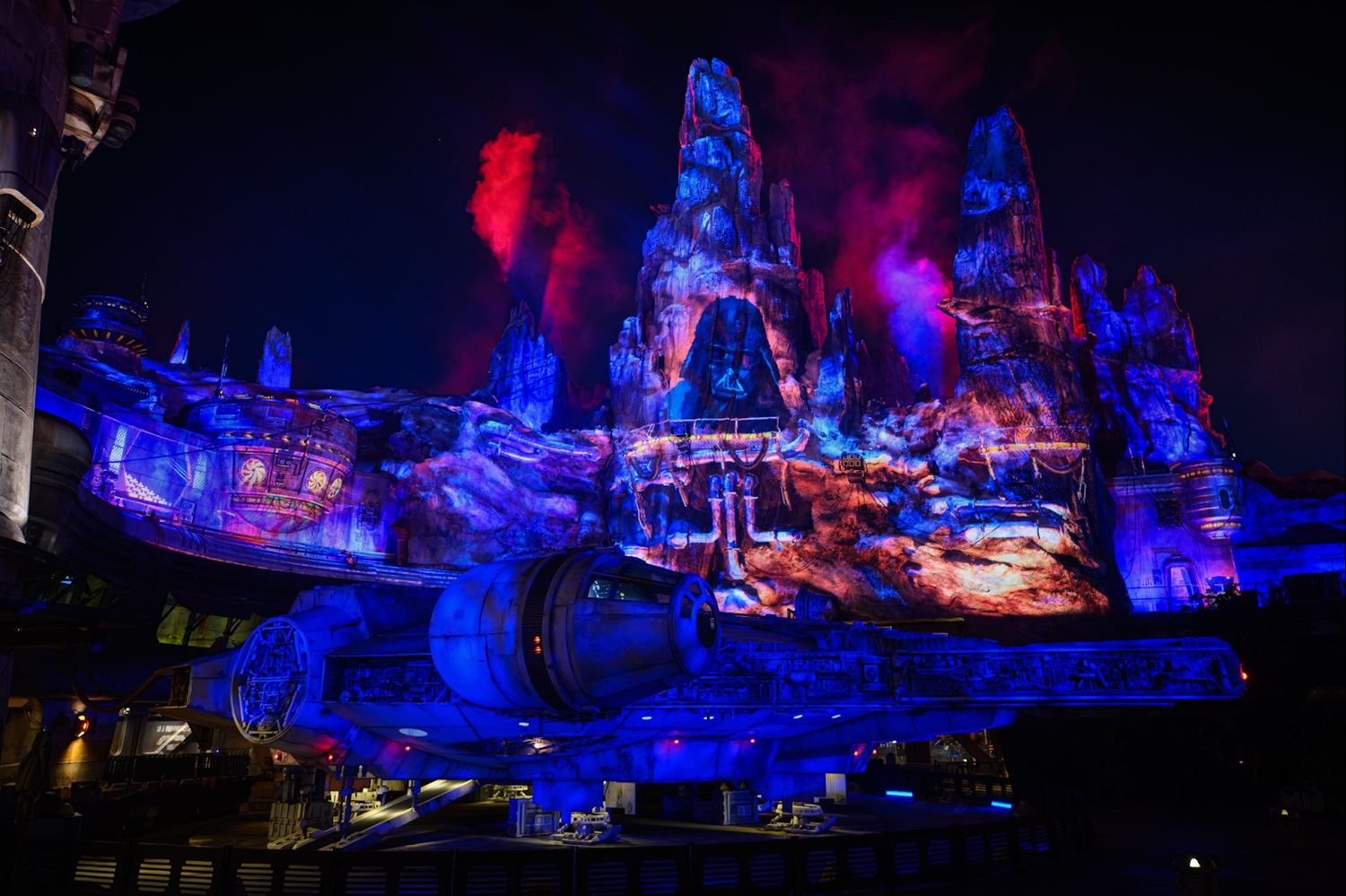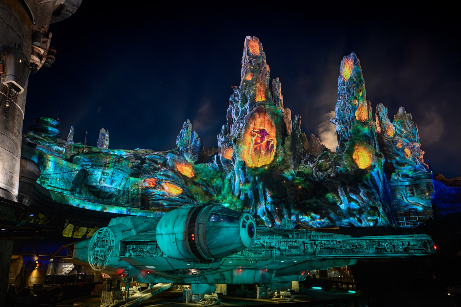 - Stunning projection effects transform the spires of Batuu near the Millennium Falcon evoking memories of some of the greatest moments in galactic history as an iconic musical score, comprised of familiar themes heard throughout the films of the Skywalker saga, draws the audience into the legendary story of the Skywalkers.