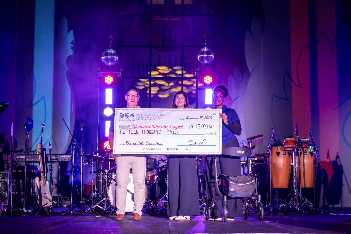 • Walt Disney World Swan and Dolphin Area General Manager Sean Verney presented the check during the closing of the two-night event to Wounded Warrior Project Community Fundraising Manager Savannah Simmons and veteran Sharona Young, a Wounded Warrior Project program beneficiary.