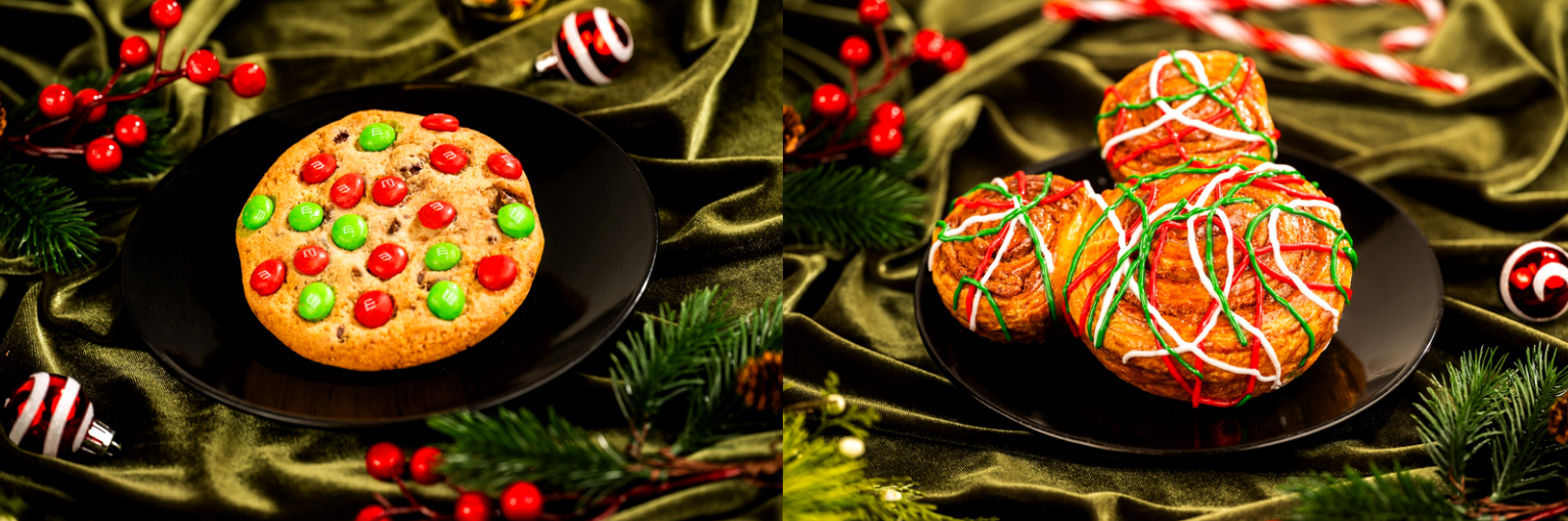 - Vanilla Éclair: Pâte à choux filled with vanilla mousse topped with marzipan, sugar Christmas lights, and a chocolate coin (New)